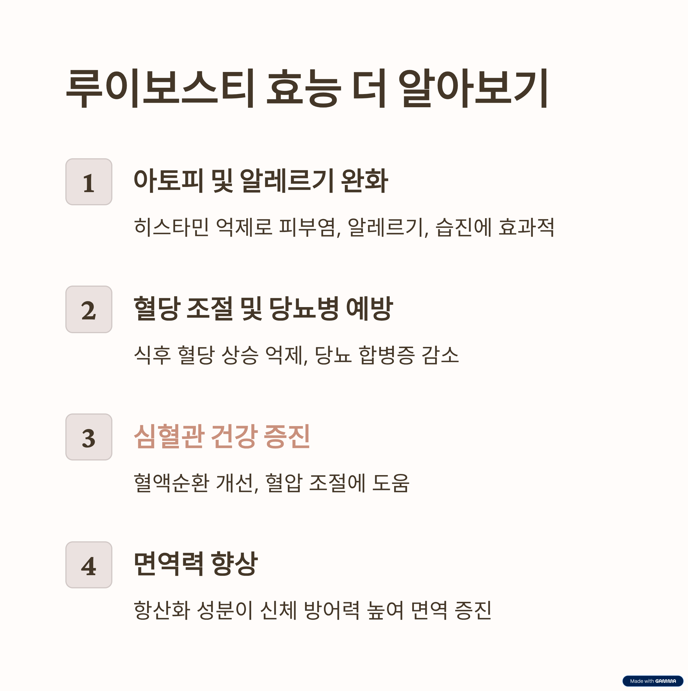 - 심혈관 건강 증진: 루이보스티는 혈액순환을 원활하게 하고 혈압을 낮추는 데 도움을 주어 심혈관 질환 예방에도 긍정적인 영향을 미칠 수 있습니다. 혈압을 낮추는 효능이 있다고 하니, 평소 혈압 관리가 필요한 분들께도 좋은 선택이 될 수 있겠죠.