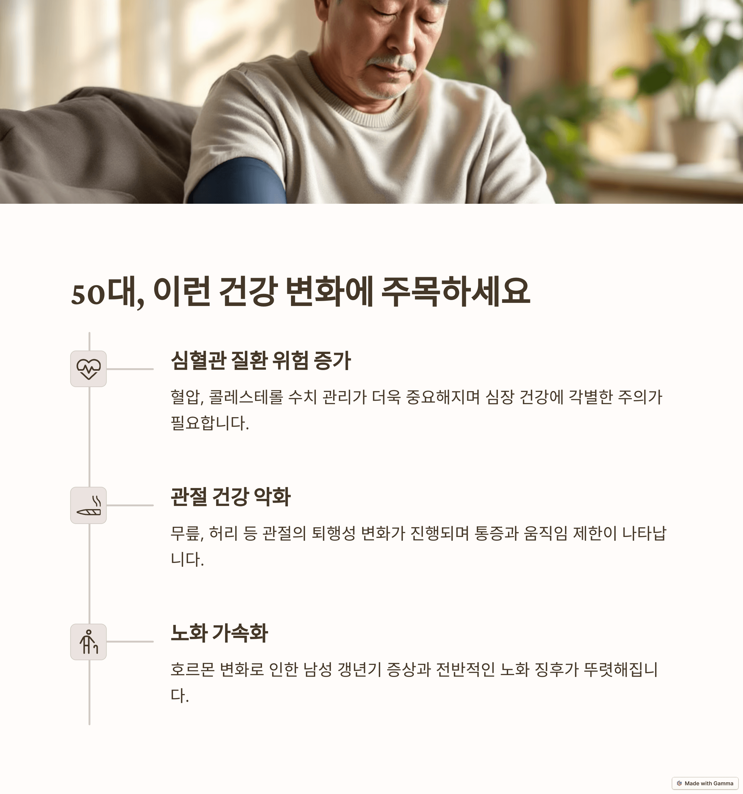 50대는 신체 기능이 저하되고 노화가 본격적으로 진행되는 시기입니다. 뼈 건강 약화, 관절 통증, 시력 저하, 기억력 감퇴 등 다양한 건강 문제가 발생할 수 있습니다. 또한, 만성 질환 발병 위험이 더욱 높아지므로 건강 관리에 더욱 신경 써야 합니다. 따라서 50대 남성에게는 노화 방지와 건강 유지를 위한 영양제 섭취가 중요합니다.