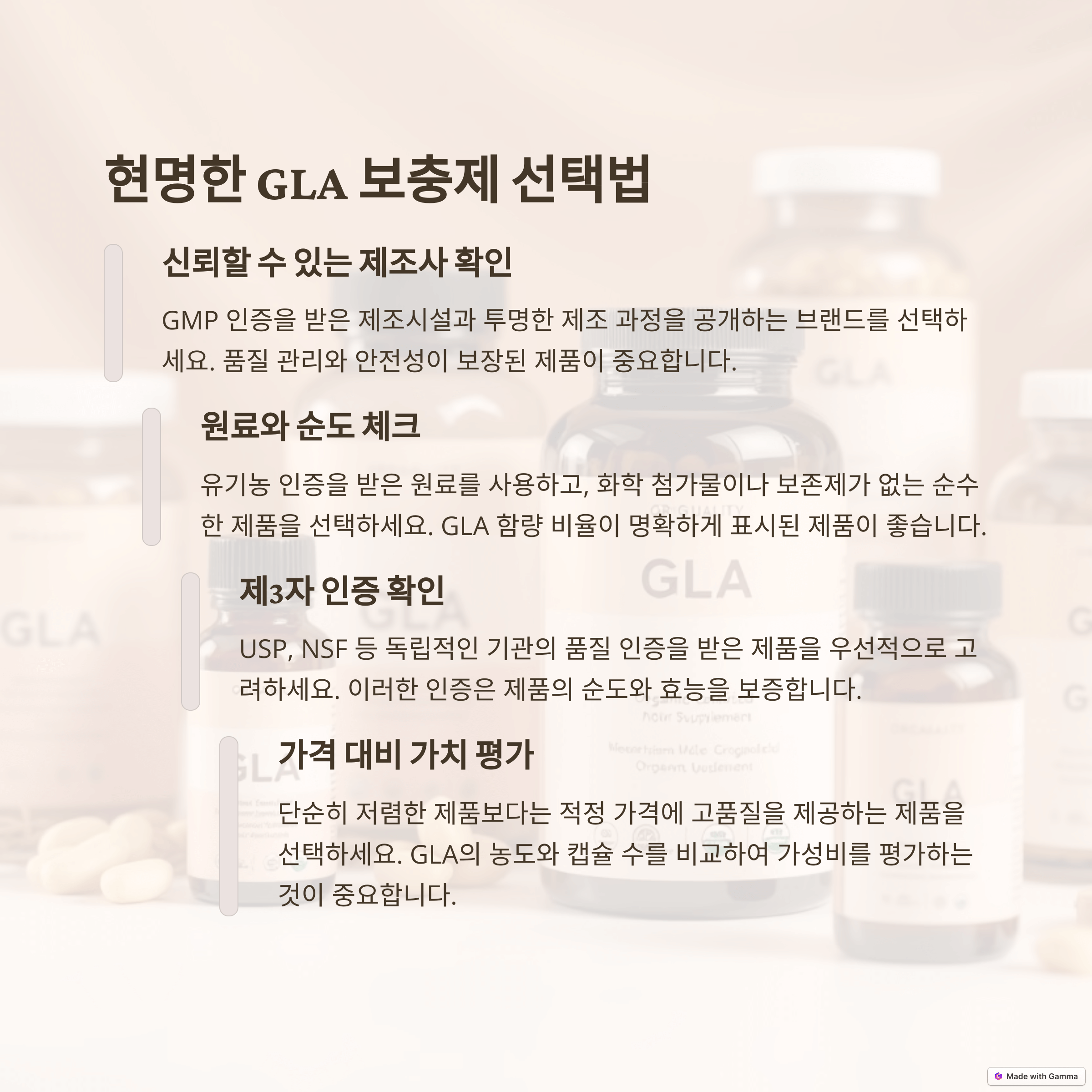 - 안전한 제품 선택: 감마리놀렌산 보충제는 다양한 제품이 판매되고 있으므로, 품질과 안전성이 검증된 제품을 선택하는 것이 중요합니다. 식약처의 GMP 인증을 받은 제품이나, 제3자 기관의 품질 검사를 통과한 제품을 선택하는 것을 권장합니다.