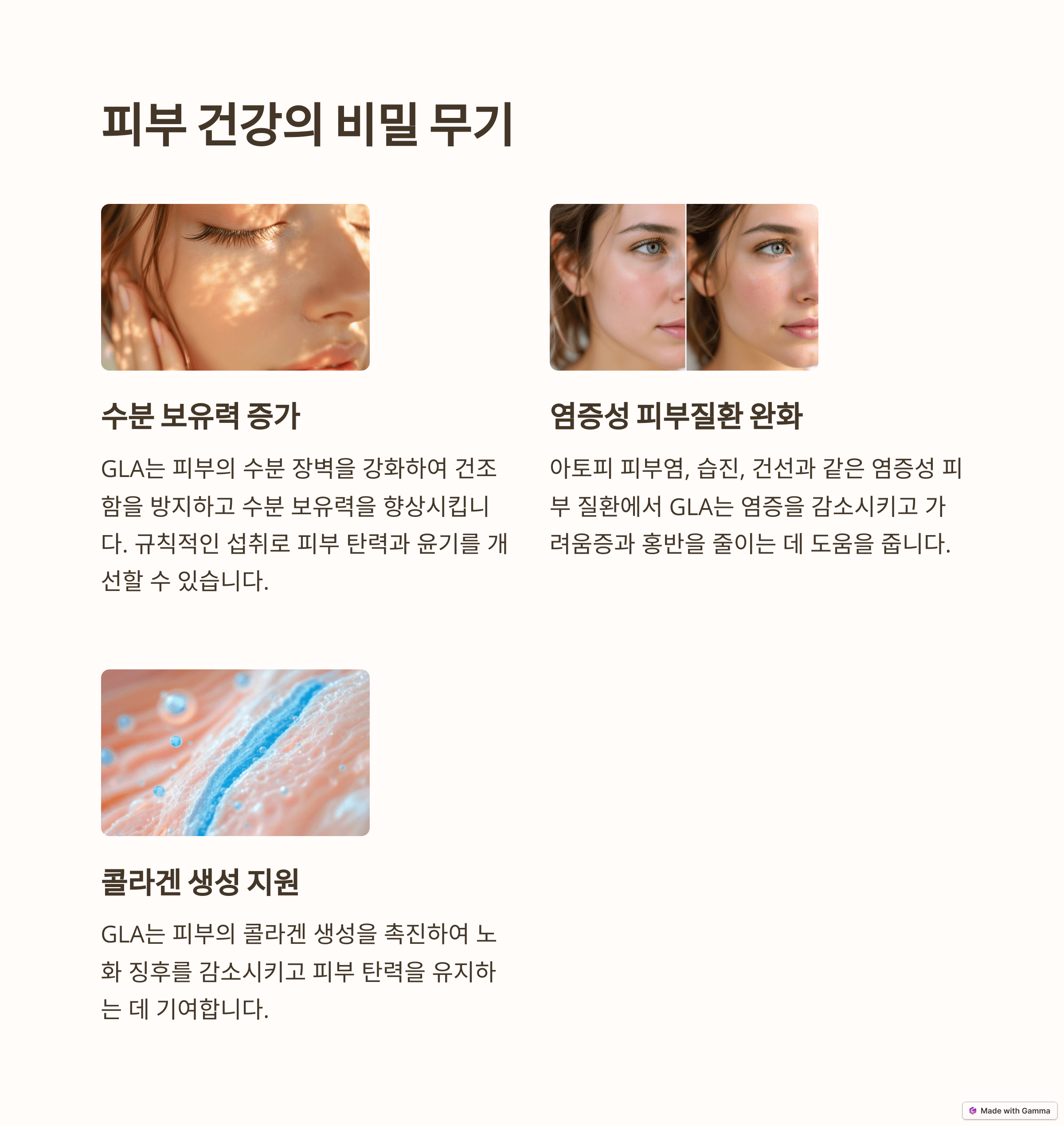 - 피부 건강 개선: 아토피 피부염, 습진, 건선 등 피부 질환 개선, 피부 보습, 탄력 유지, 여드름 완화에 도움이 됩니다. 감마리놀렌산은 피부 세포의 지질 구조를 개선하고, 염증을 줄여 피부 건강을 증진시키는 효과가 있습니다.