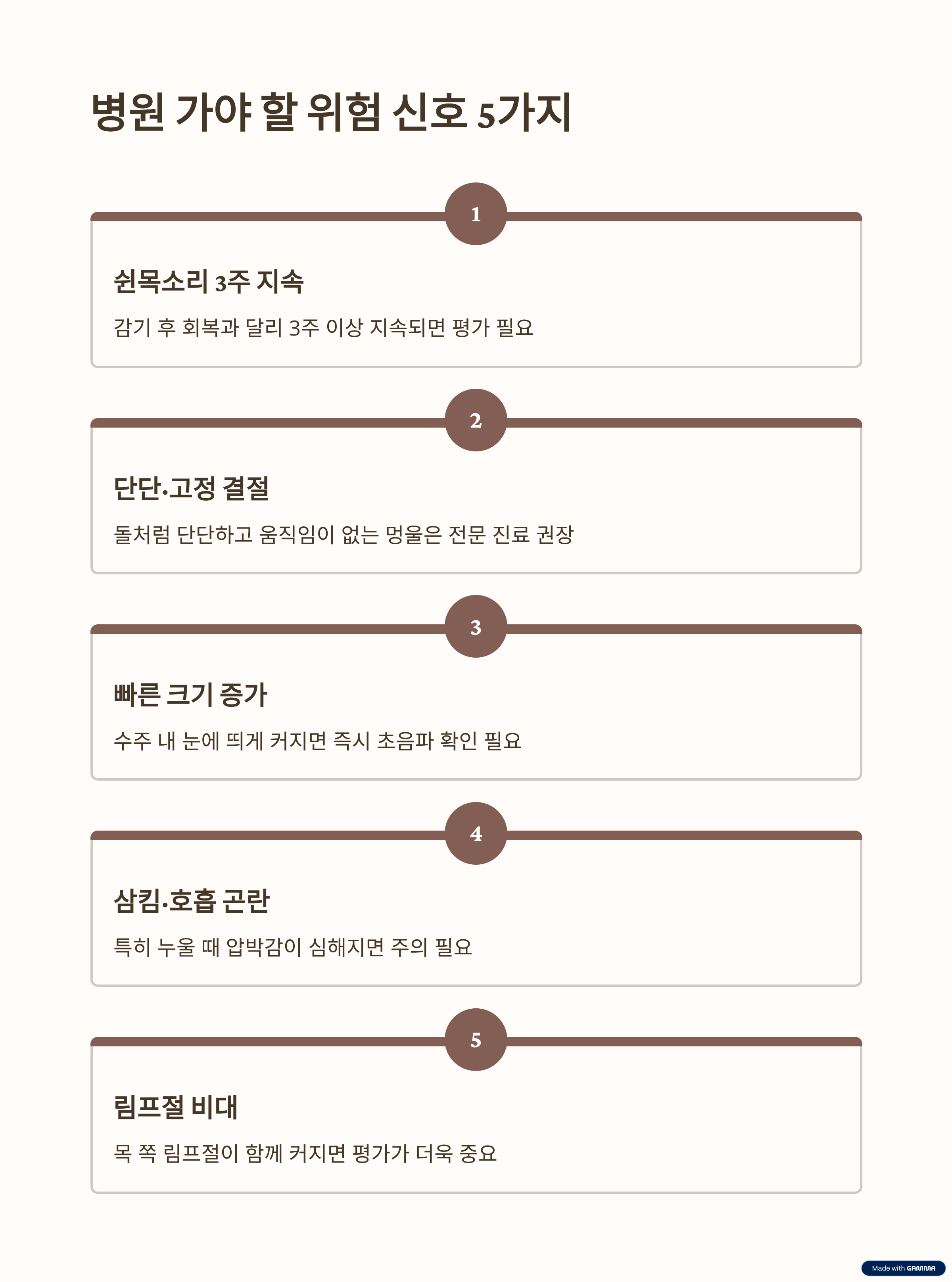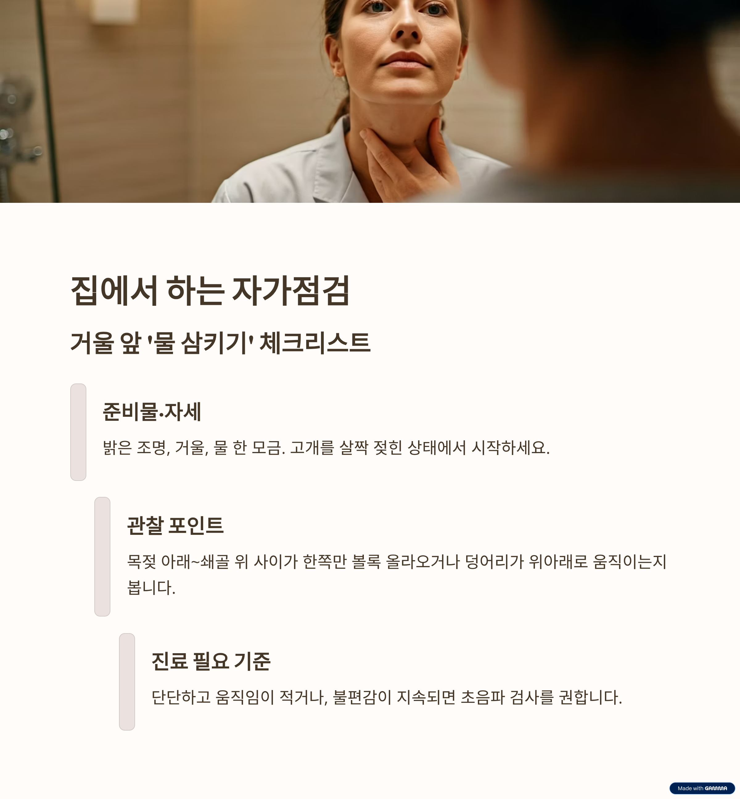 - 자가체크: 거울 앞 물 삼키기, 단단·고정 결절은 병원 권장