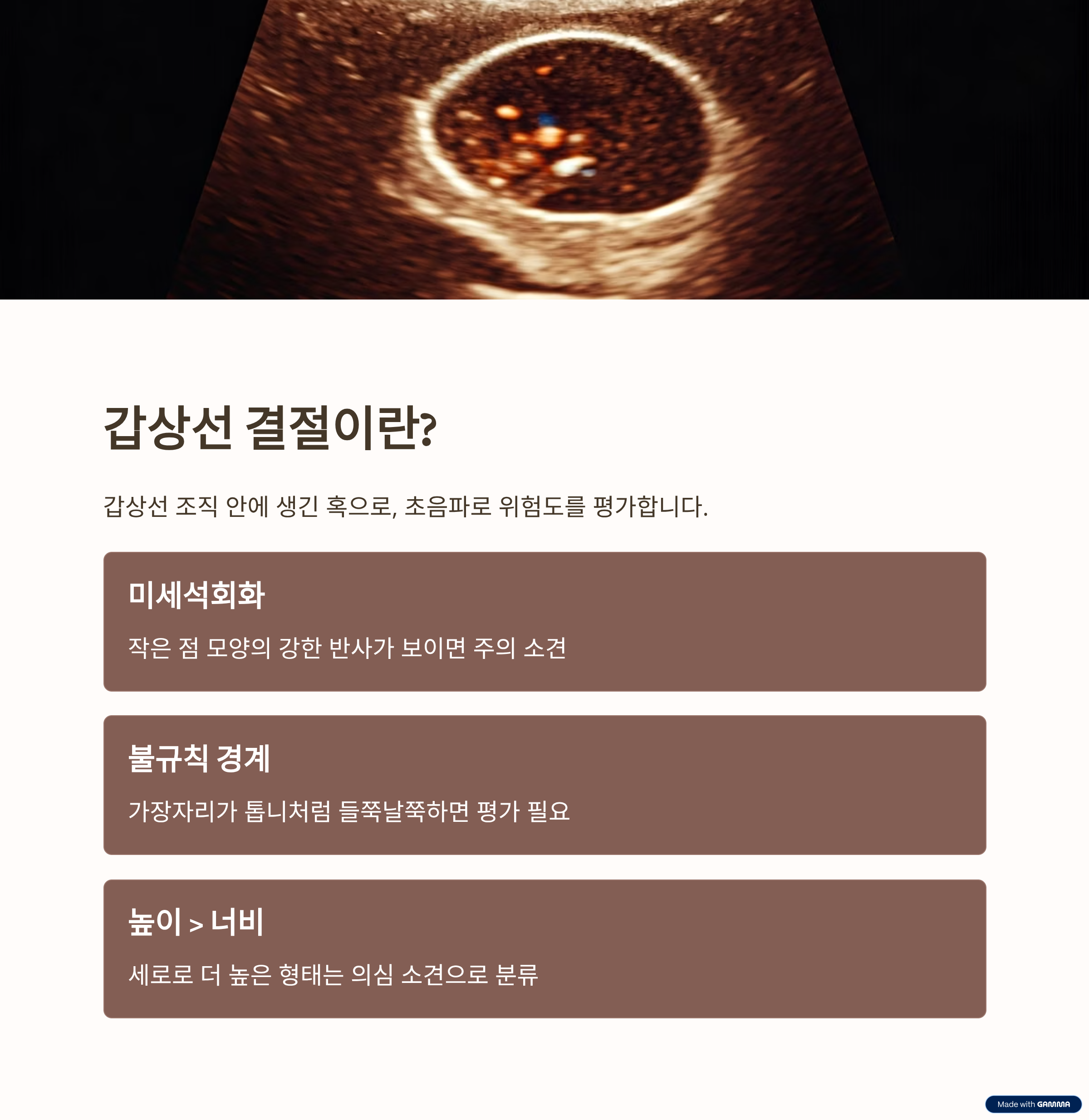 갑상선 결절은 갑상선 조직 안에 생긴 혹을 말해요. 초음파로 모양과 성상에 따라 위험도를 나눕니다.