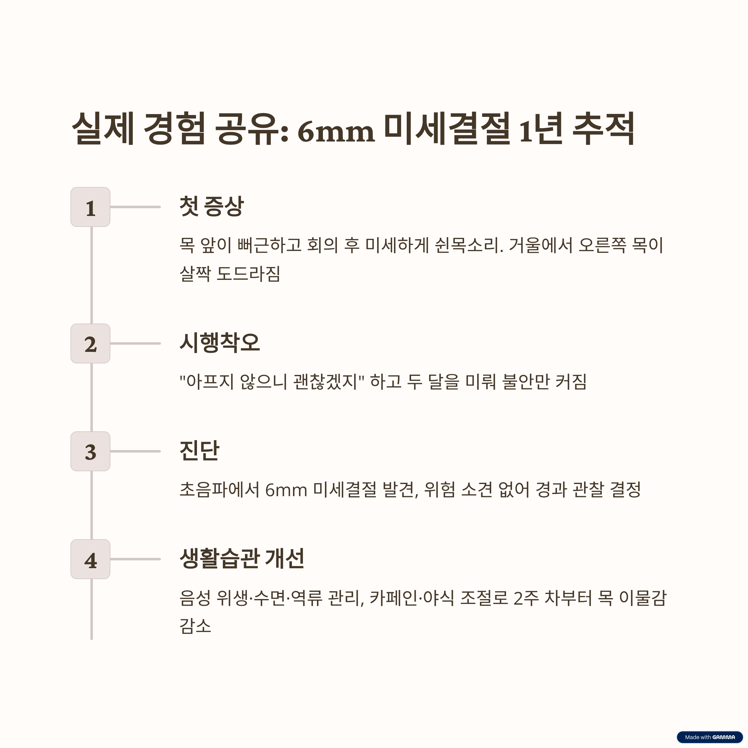 초음파에서 6mm 미세결절이 보였지만 위험 소견이 없어 경과 관찰로 결정. 음성 위생·수면·역류 관리에 집중했어요.