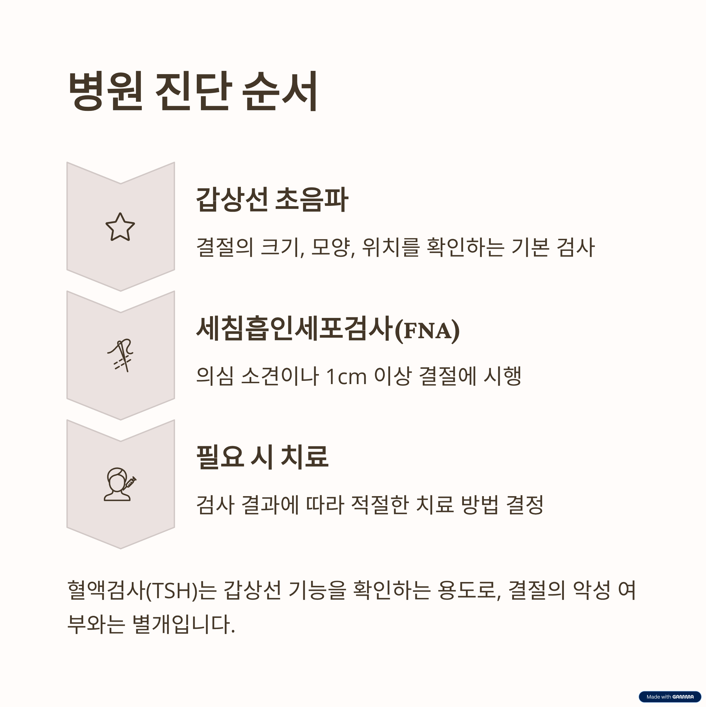 병원 진단 순서: 갑상선 초음파 → 세침흡인세포검사(FNA) → 필요 시 치료