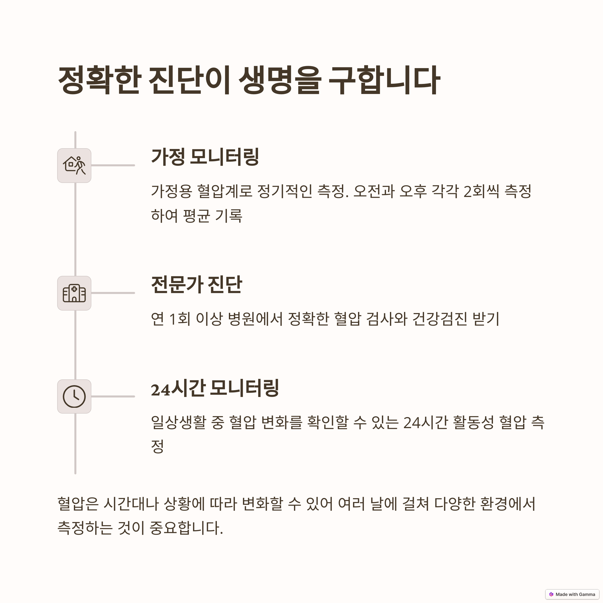 | 정기적인 검진 | 40세 이상 성인은 1년에 1회 이상 혈압 측정. 고혈압 가족력 또는 위험 요인 보유 시 더 자주 측정. | 가정 혈압 측정 시 주의사항: 아침, 저녁 같은 시간에 측정, 측정 전 안정 취하기. |