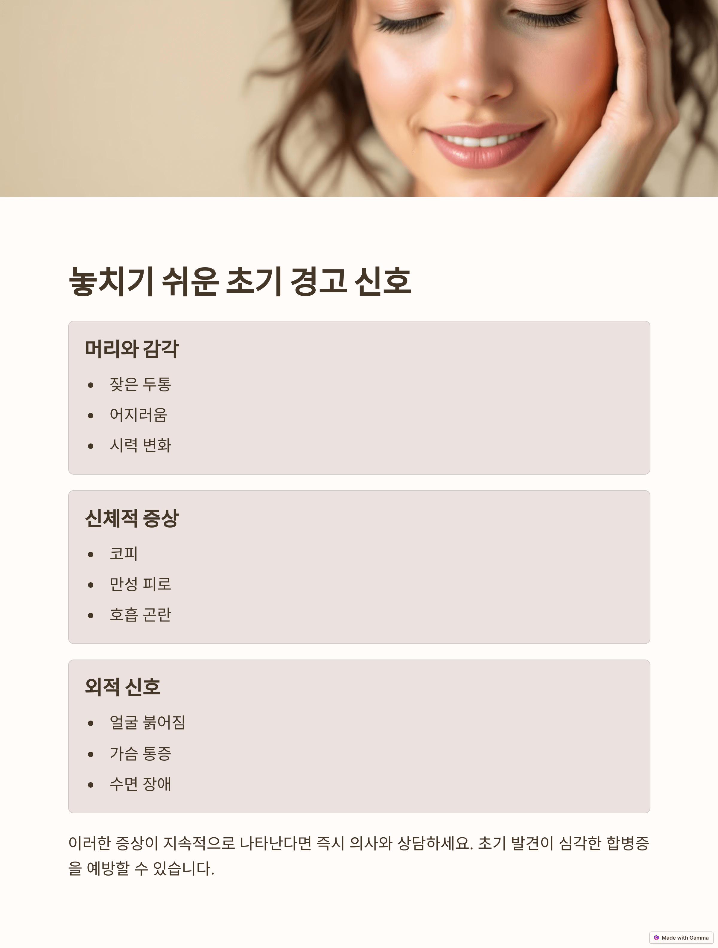 고혈압은 초기 증상이 뚜렷하지 않아 '침묵의 살인자'라고 불립니다. 방치할 경우 심혈관 질환, 뇌졸중 등 심각한 합병증을 유발할 수 있으므로, 평소 건강 상태에 관심을 갖고 정기적인 혈압 측정과 함께 자가 진단을 통해 고혈압 초기 증상을 알아채는 것이 중요합니다. 이 글에서는 고혈압 초기 증상 6가지 자가 진단법과 예방 및 관리 가이드를 제공합니다.
