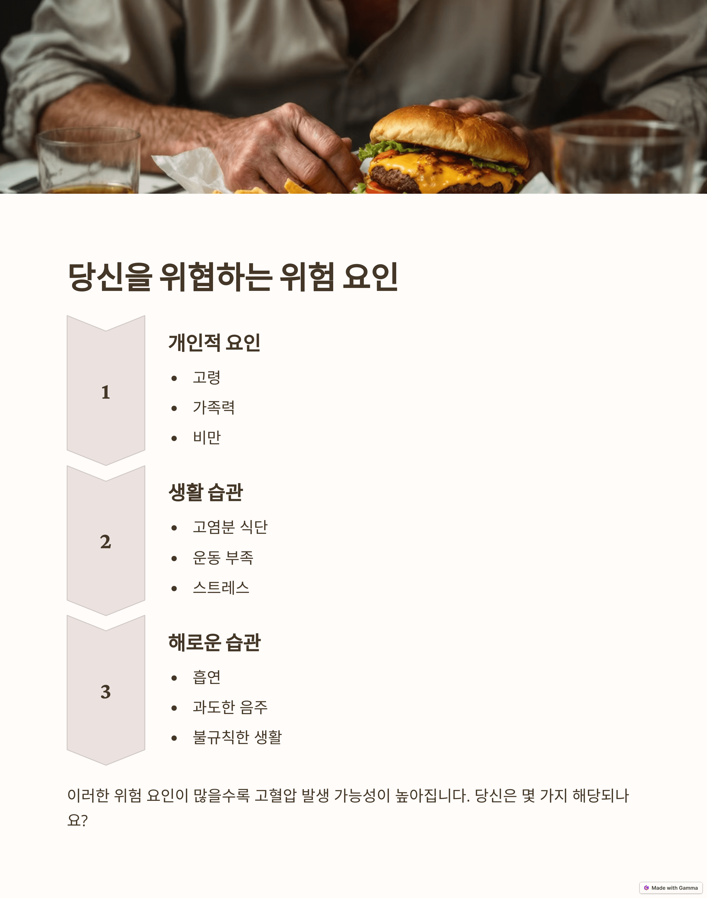 고혈압은 심장 혈관에 동맥경화를 유발하여 협심증, 심근경색 등 심혈관 질환 위험을 높입니다. 가슴을 쥐어짜는 듯한 통증이 15분 이상 지속될 경우 심근경색을 의심하고 즉시 응급실을 방문해야 합니다.