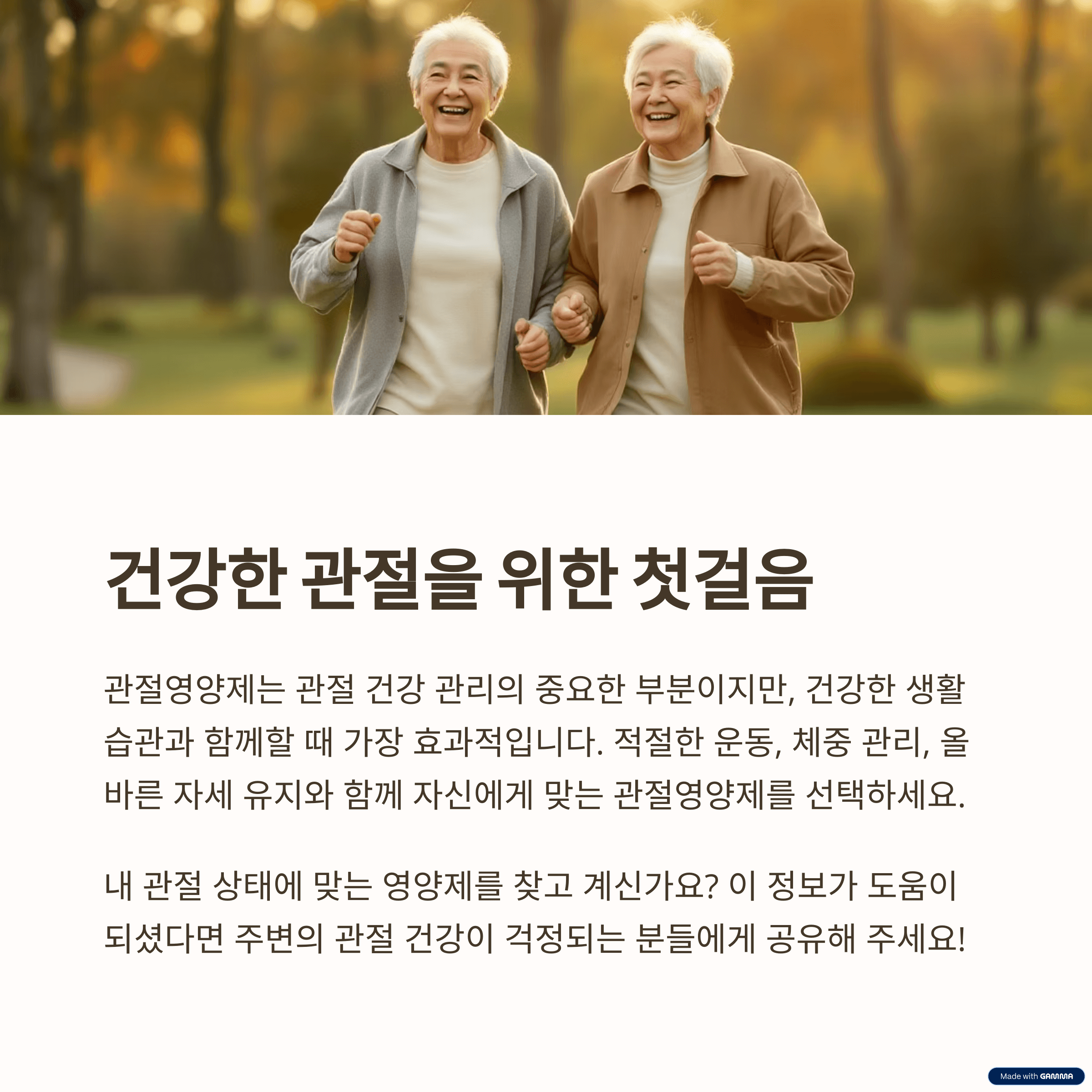 내게 맞는 관절영양제를 정확히 파악하고, 평소 꾸준한 관리와 운동, 체중 유지와 함께 실천하시길 권장합니다.