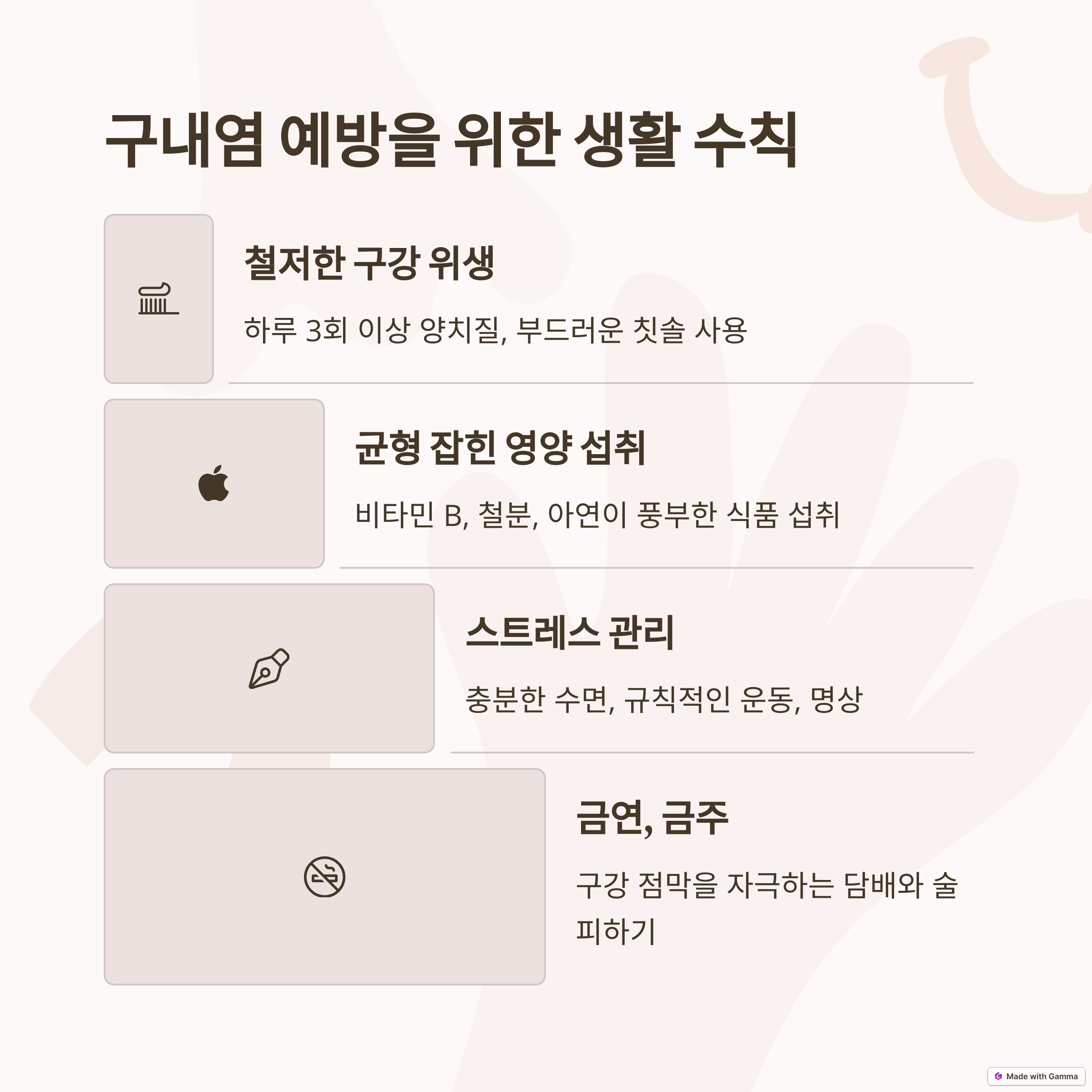 구내염 예방을 위해 다음과 같은 방법들이 도움이 될 수 있습니다:
