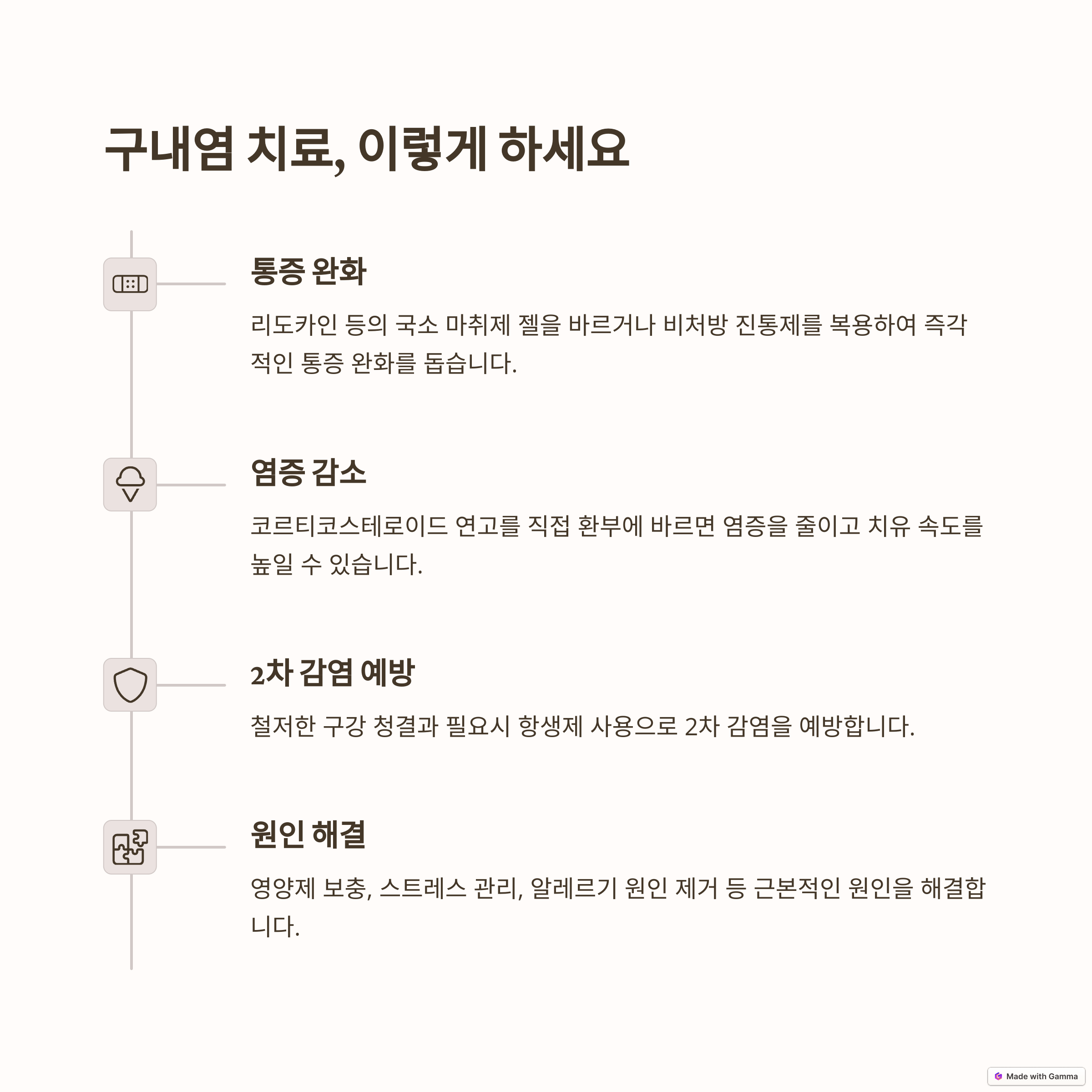 구내염의 치료는 원인에 따라 다소 다르며, 일반적인 치료 방법은 다음과 같습니다: