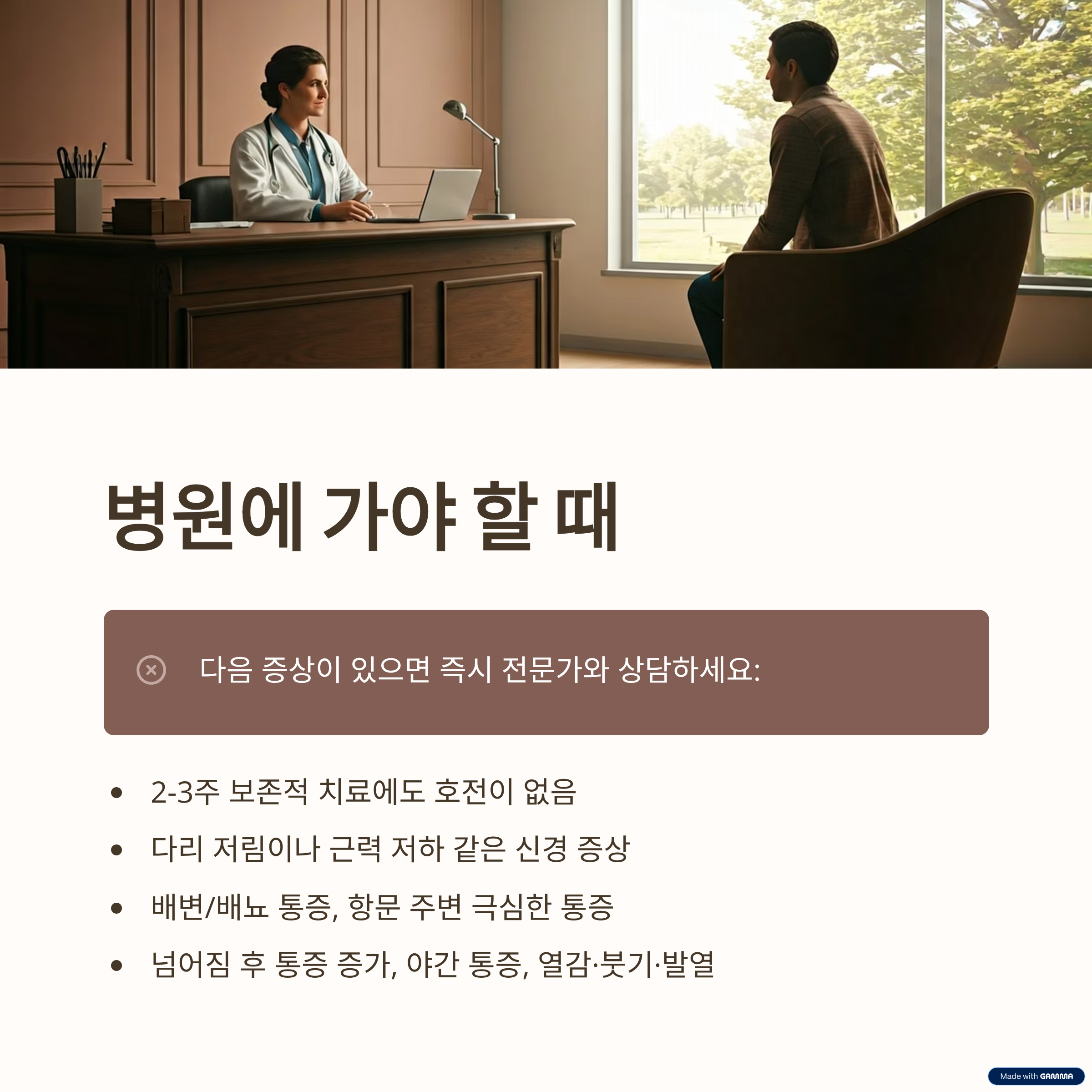 - 2~3주 호전 없거나 저림·발열·배변 이상 동반 시 진료