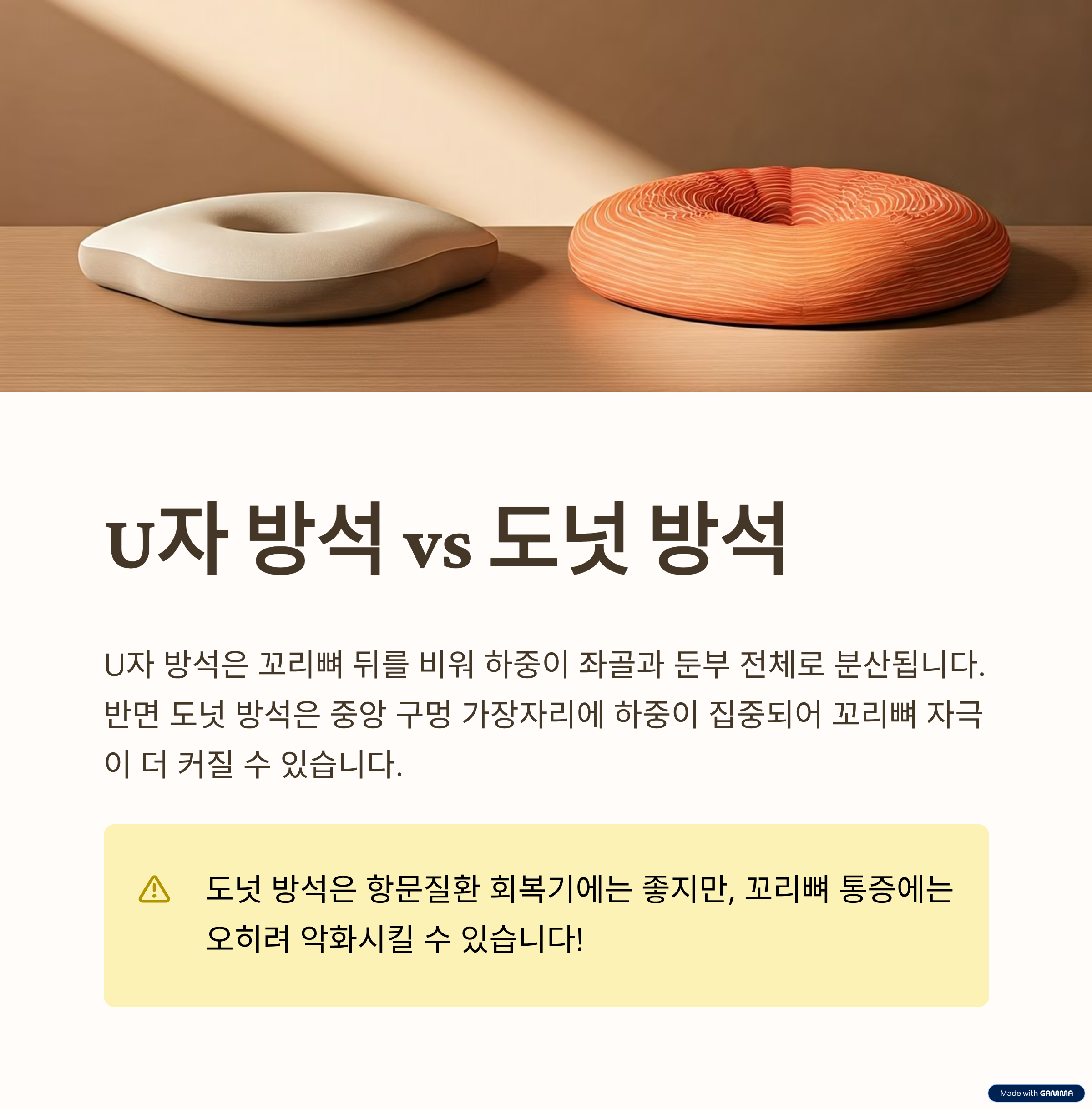 | 도넛 방석 | 항문 수술 후 압박 완화 | 꼬리뼈 압력 집중으로 악화 가능 | 항문질환 회복기(꼬리뼈 통증엔 비권장) |