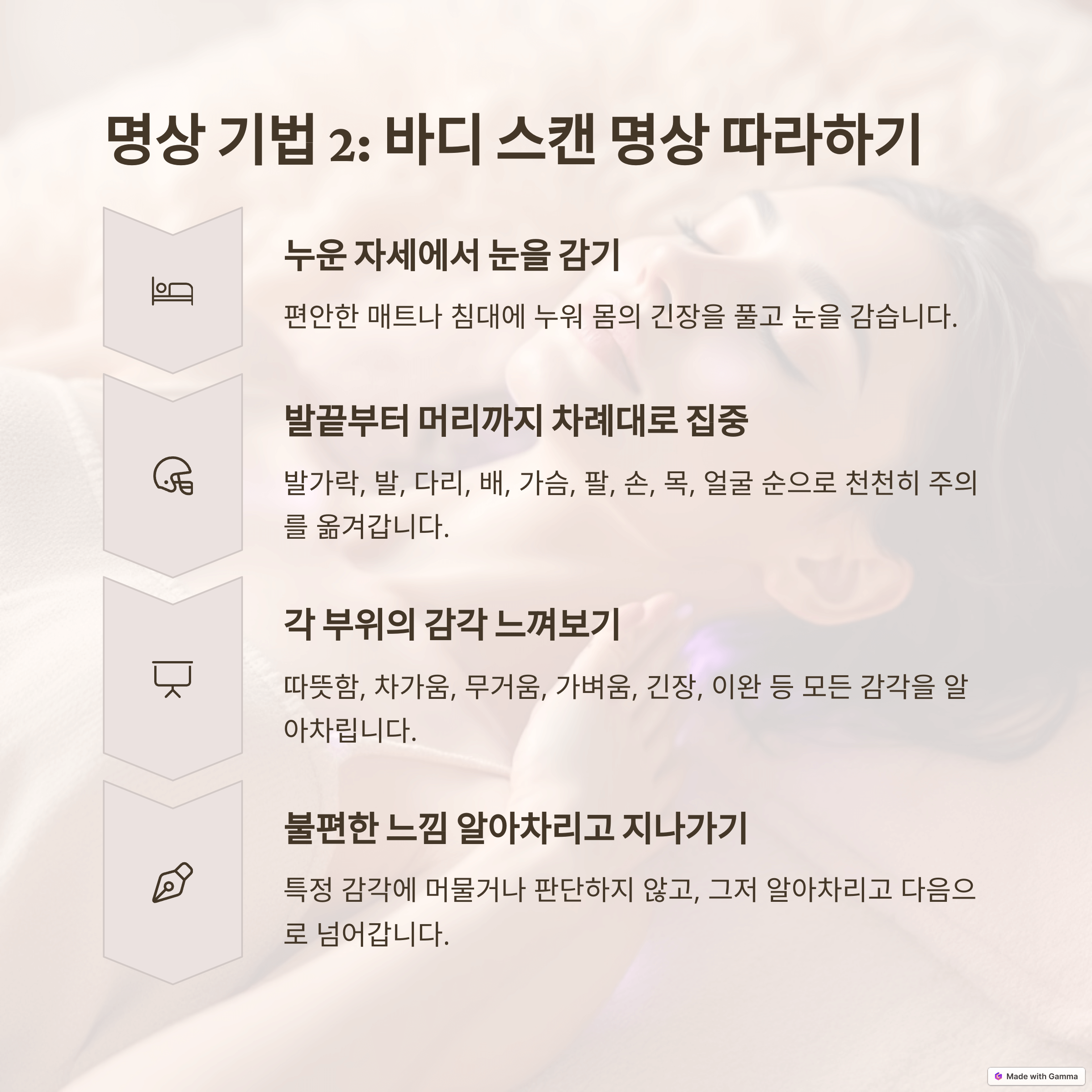 - 눈을 감고 숙련된 가이드의 안내에 따라 몸의 각 부분을 이완시키고, 다양한 감각을 느끼고, 편안한 이미지를 시각화합니다.