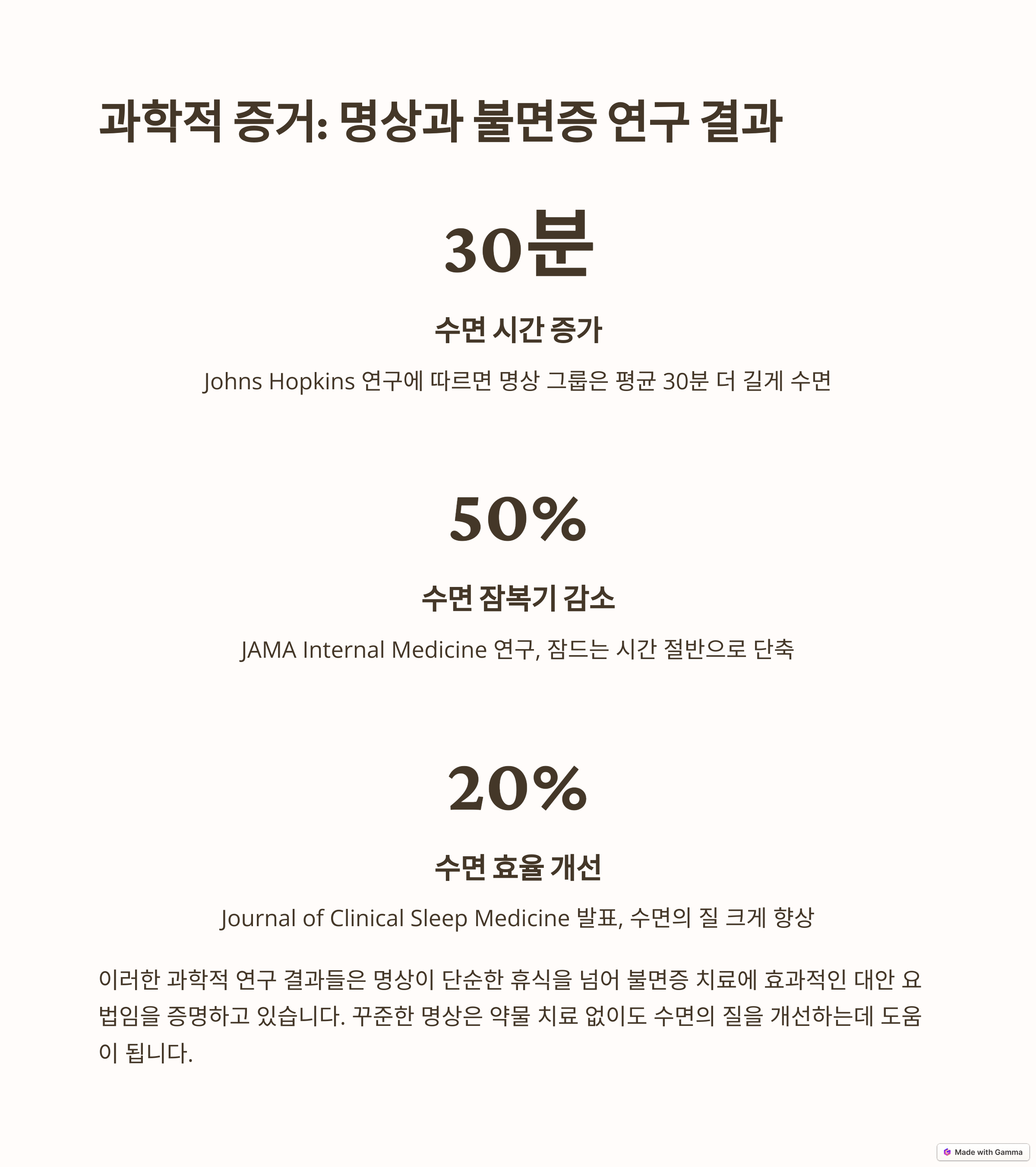 | Johns Hopkins University 연구 | 명상이 불안, 우울증, 통증 완화에 효과적이며, 이는 궁극적으로 수면 개선으로 이어진다는 것을 보여줍니다. |