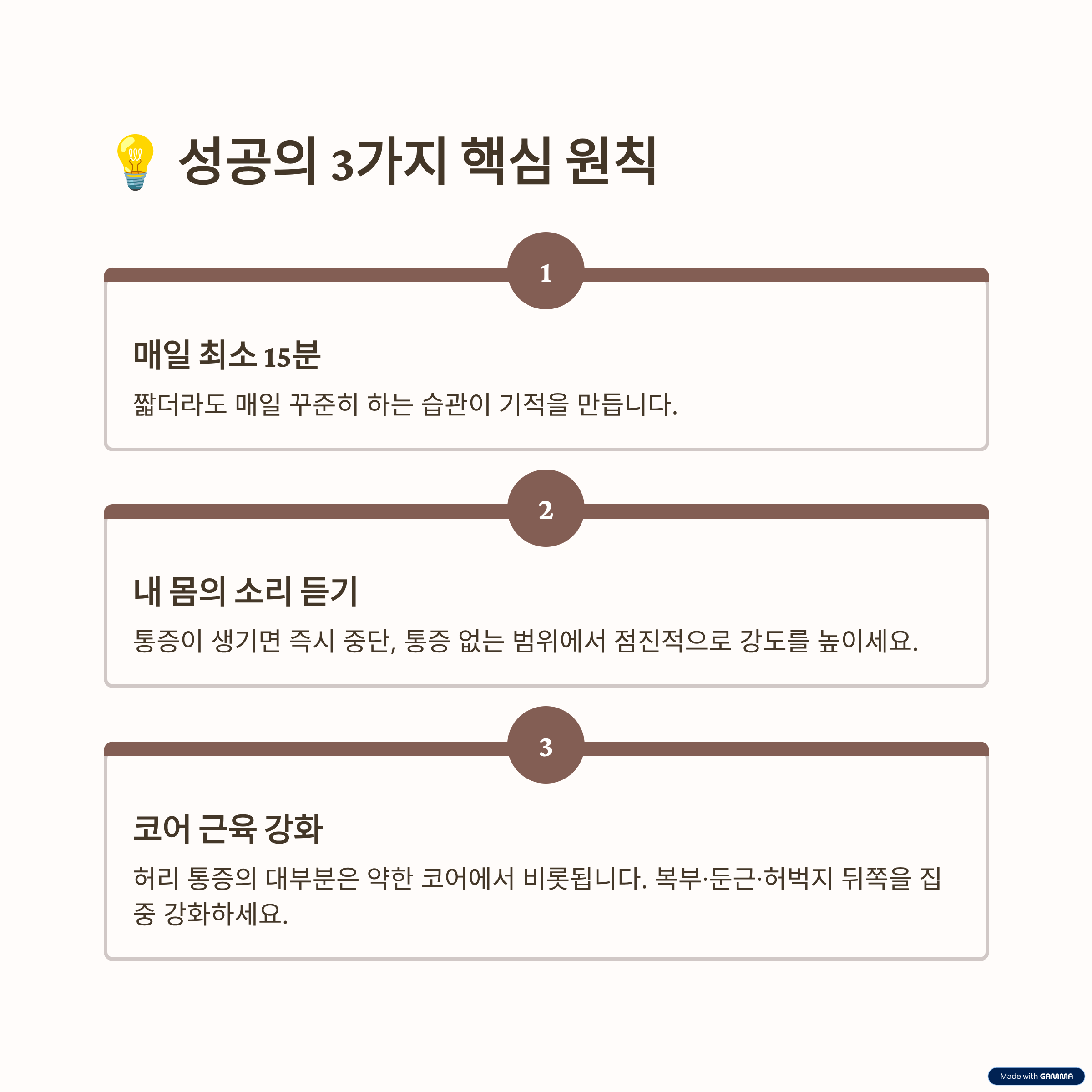 매일 헬스장에 갈 여유가 없더라도, 집에서 15분이라도 투자하는 것이 핵심입니다. 짧더라도 매일 하는 습관이 통증 완화에 가장 큰 도움이 되었어요.