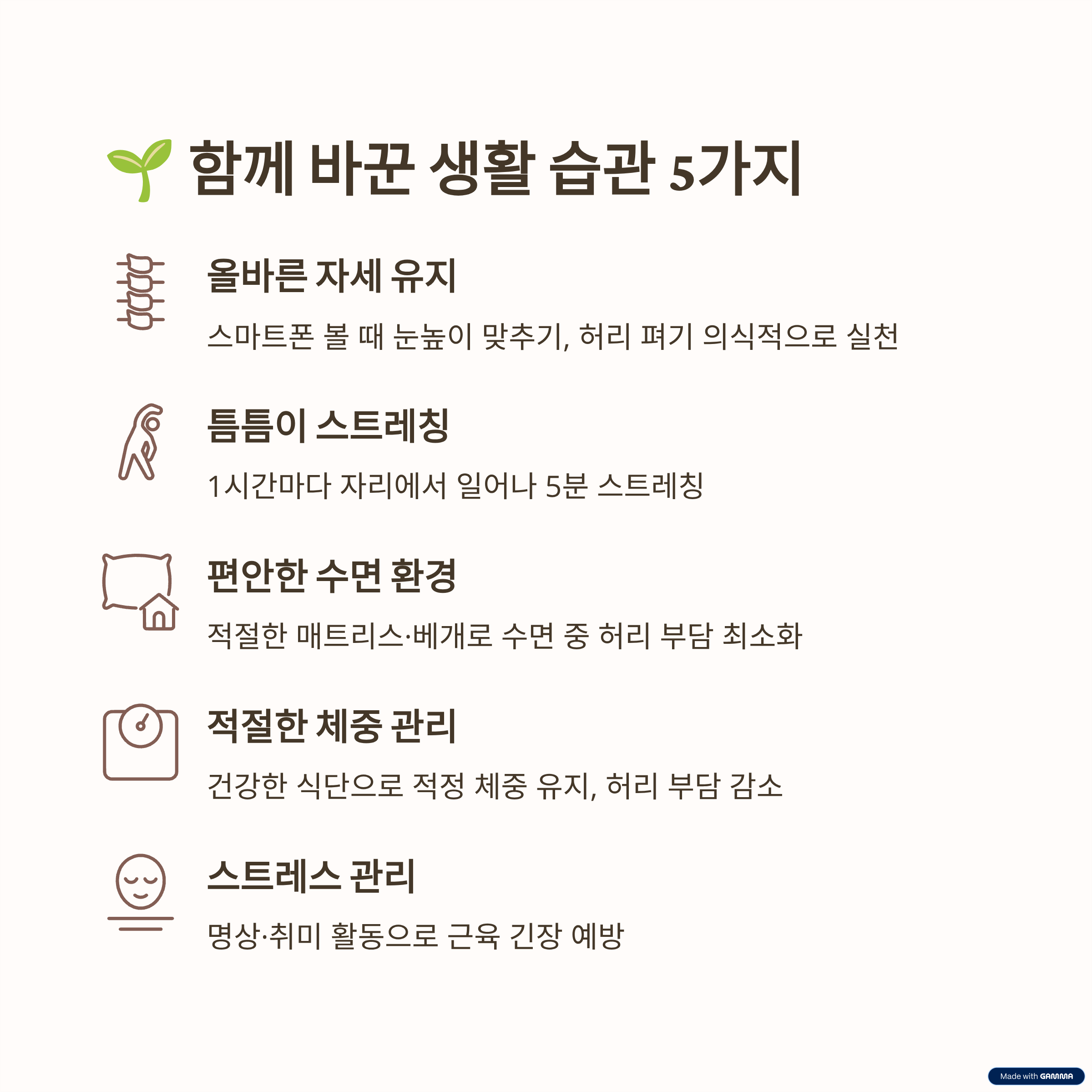 4. 생활 습관 개선 병행: 올바른 자세, 틈새 스트레칭, 체중 관리가 시너지 효과를 냅니다.