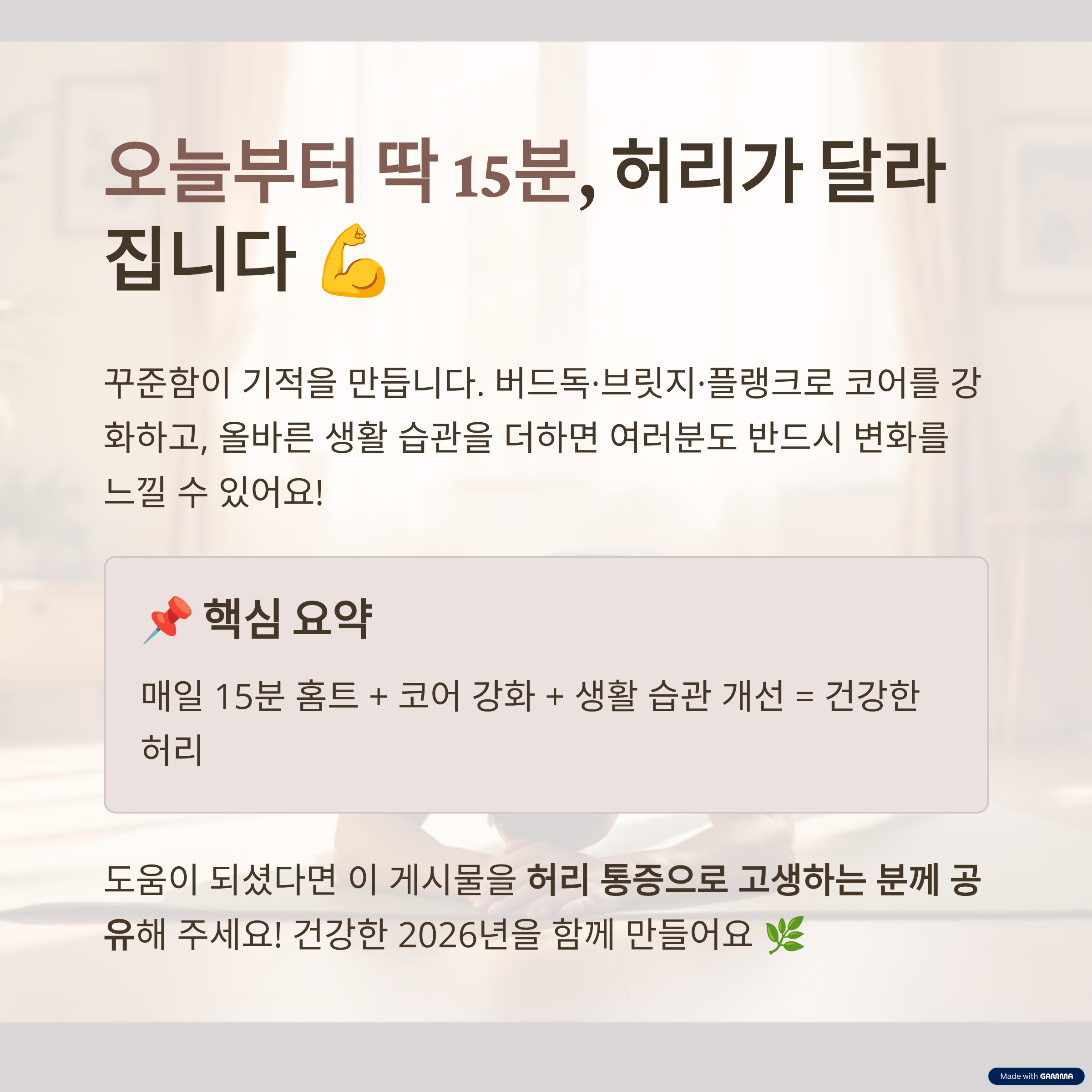 저의 3개월 허리 통증 완화 홈트 성공기가 여러분께도 작은 희망과 동기 부여가 되었기를 바랍니다. 건강한 허리로 활기찬 2026년을 보내시길 응원할게요!