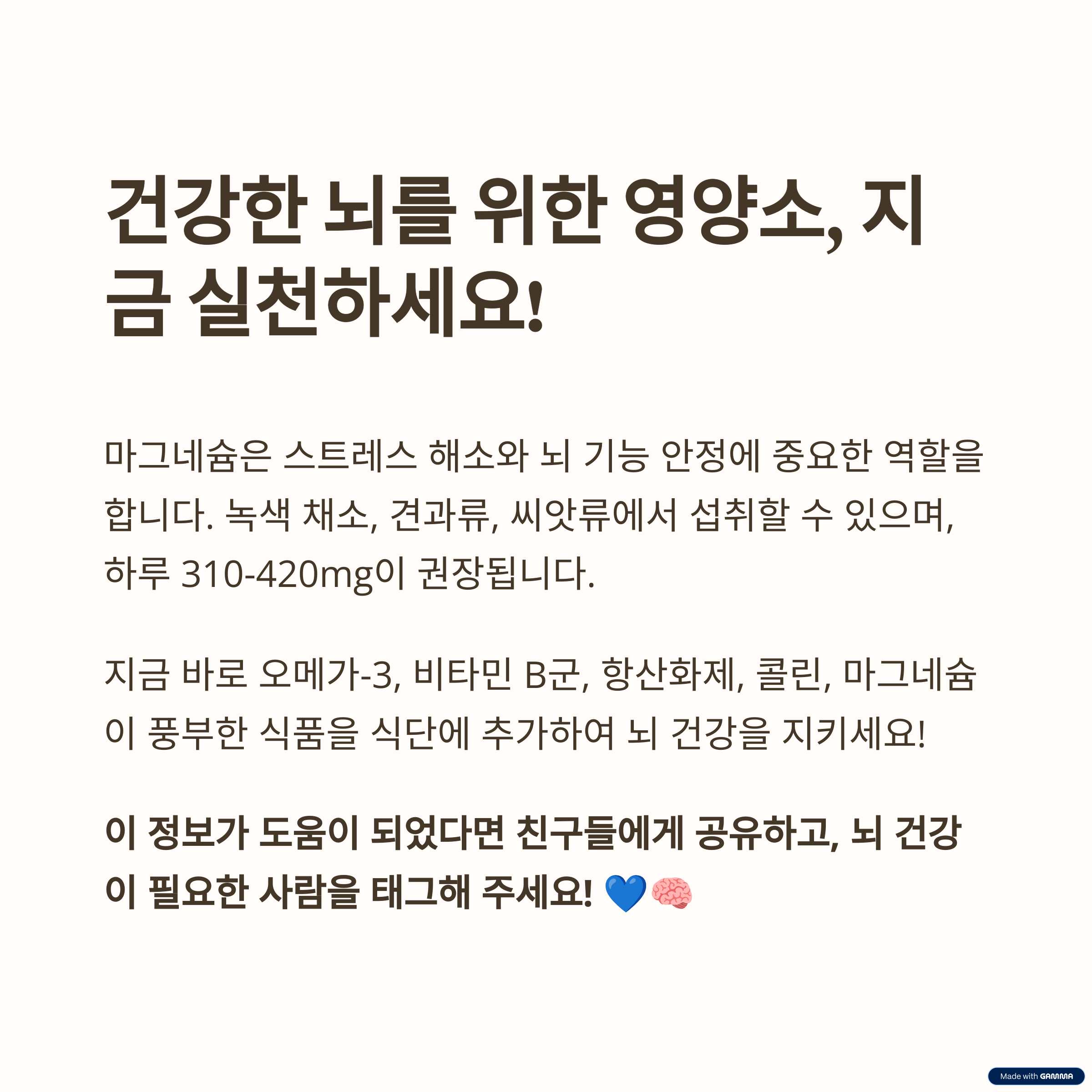 뇌 건강에 좋은 영양소들을 꼼꼼하게 챙겨 드시면, 우리의 뇌는 더욱 건강하고 활기차게 활동할 수 있습니다. 오늘부터 식단을 조금만 신경 써서 뇌 건강을 위한 영양소를 충분히 섭취하고, 건강한 뇌를 유지해 보세요! 💪✨