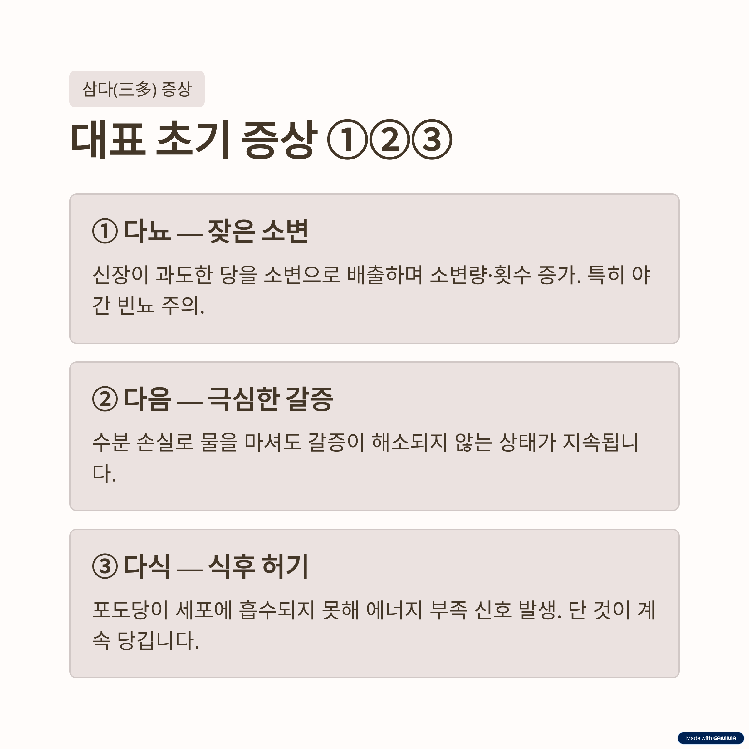 - 1. 당뇨 초기 증상은 '삼다(多)' (다뇨, 다음, 다식)가 대표적입니다.