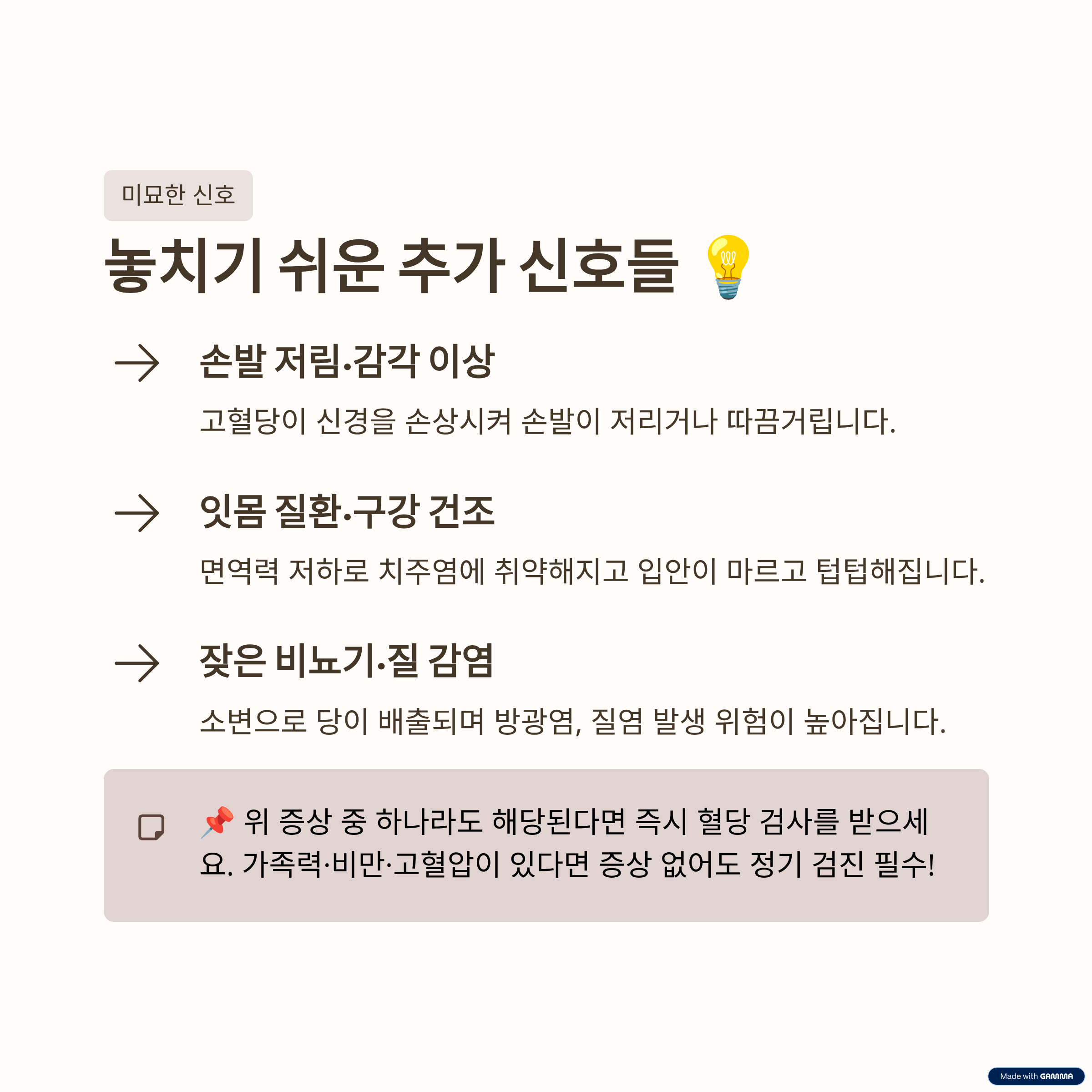 - 2. 급격한 체중 변화, 피로감, 시야 흐림 등도 중요한 신호입니다.