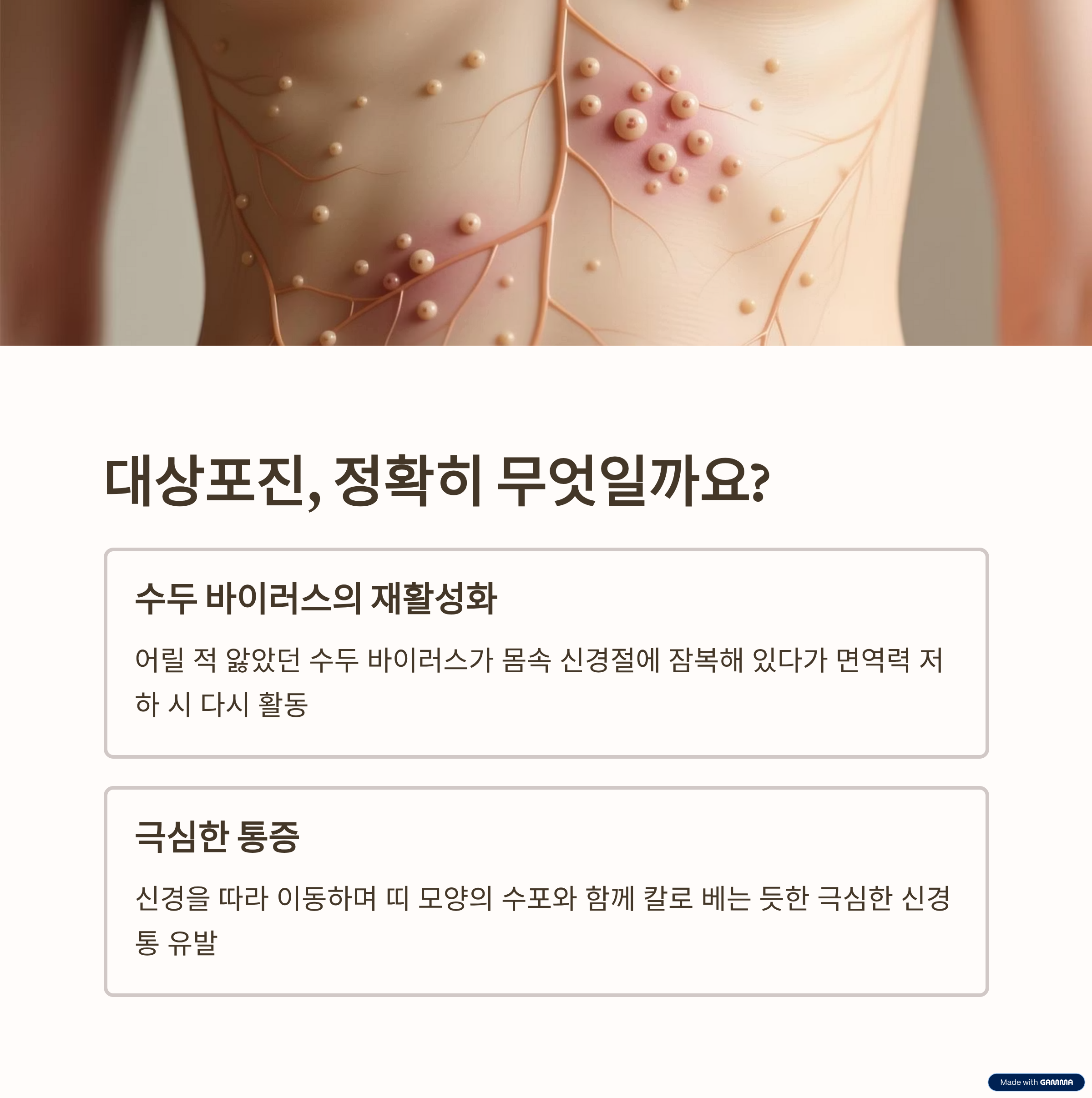 - 대상포진은 어릴 적 수두 바이러스가 몸속에 잠복해 있다가 면역력이 떨어질 때 활성화되어 발생하는 극심한 통증의 질환입니다.