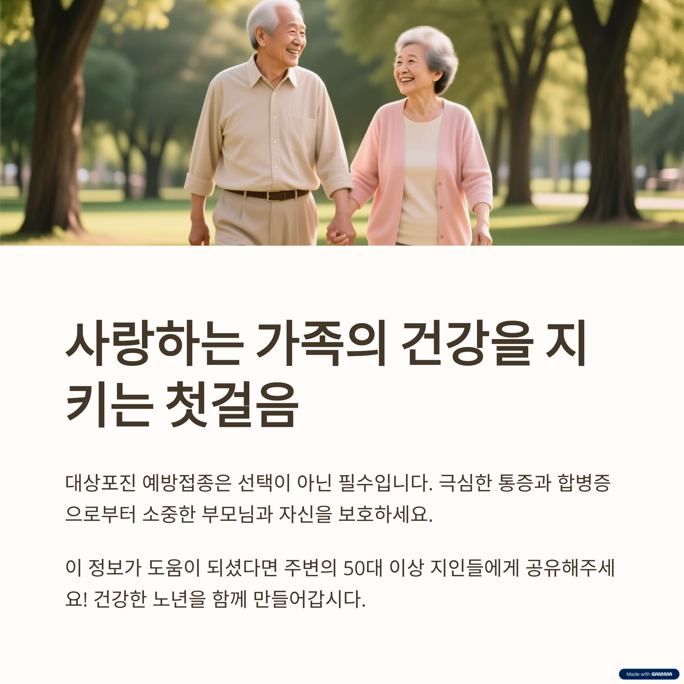 - 50대 이상은 대상포진 예방접종을 통해 발병률을 현저히 낮추고, 발생 시 통증 및 합병증을 경감할 수 있습니다.