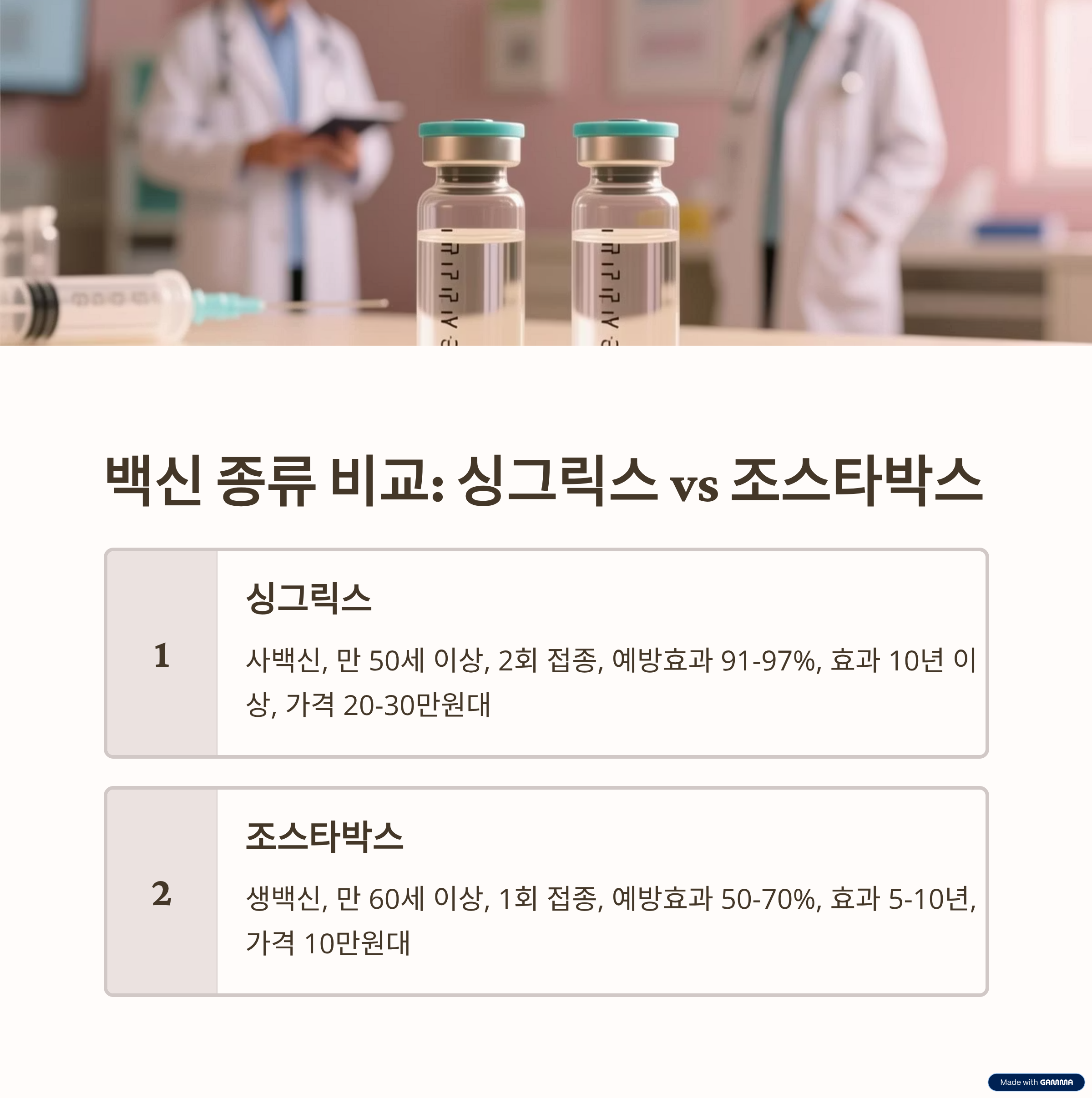 - 싱그릭스와 조스타박스 두 가지 백신이 있으며, 각각의 접종 대상, 효과 지속 기간, 가격, 접종 횟수 등에 차이가 있습니다.