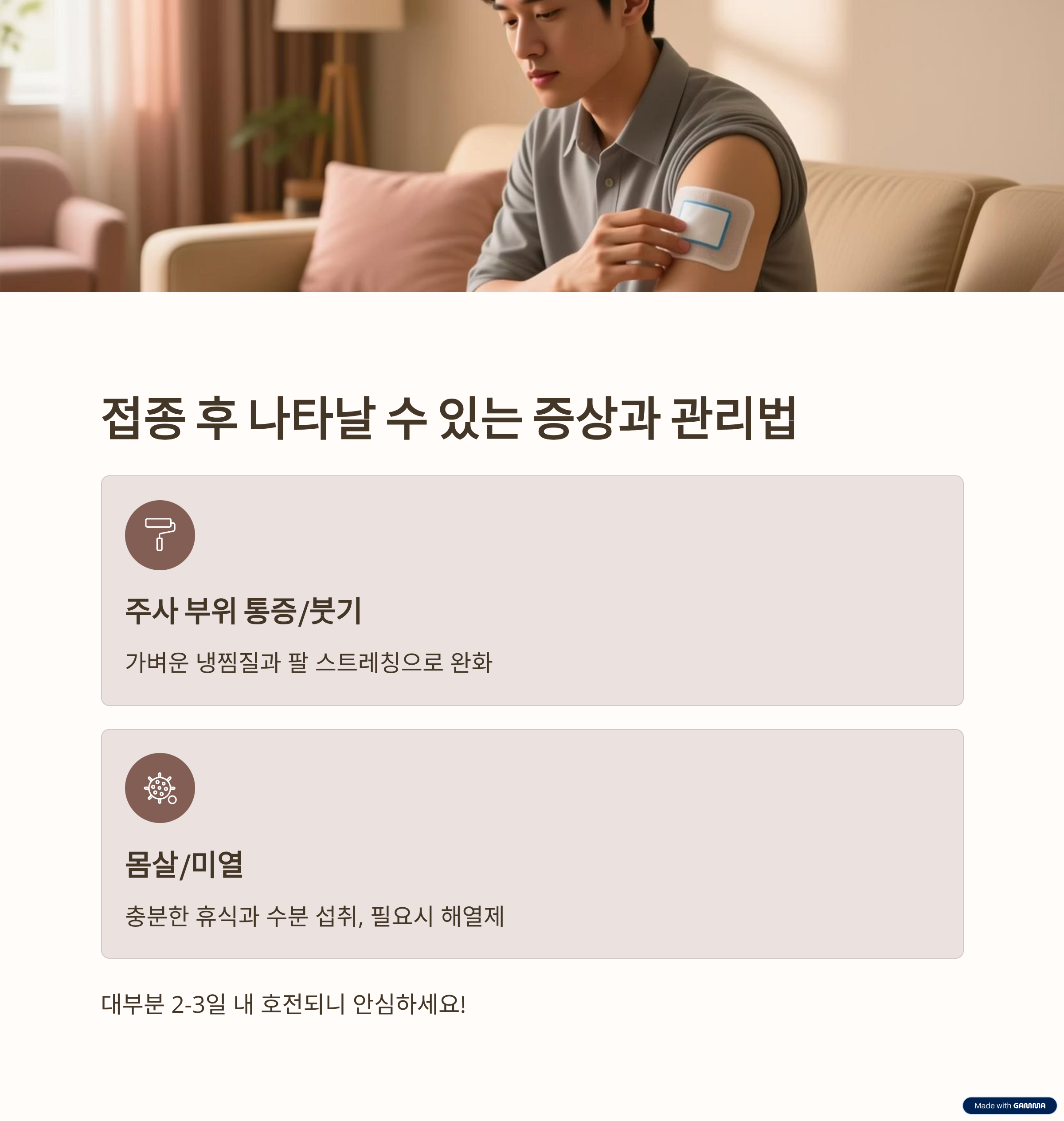 - 접종 후 발생할 수 있는 가벼운 부작용(주사 부위 통증, 몸살 기운 등)에 대한 대처법과 관리 팁을 알아두는 것이 좋습니다.