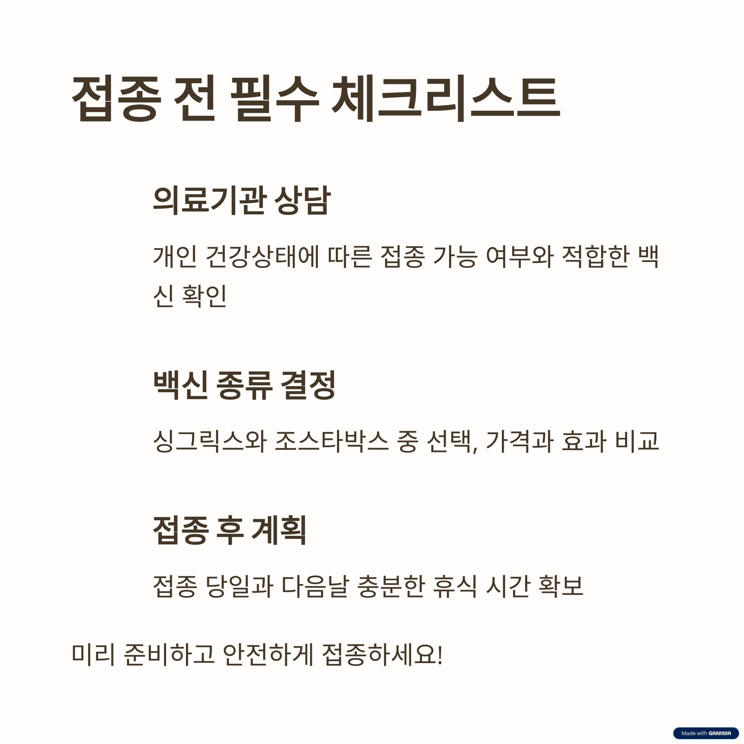- 백신 종류 확인: 싱그릭스, 조스타박스(스카이조스타) 중 어떤 백신을 맞을지 결정하고, 가격과 접종 횟수, 효과 지속 기간 등을 미리 확인합니다.