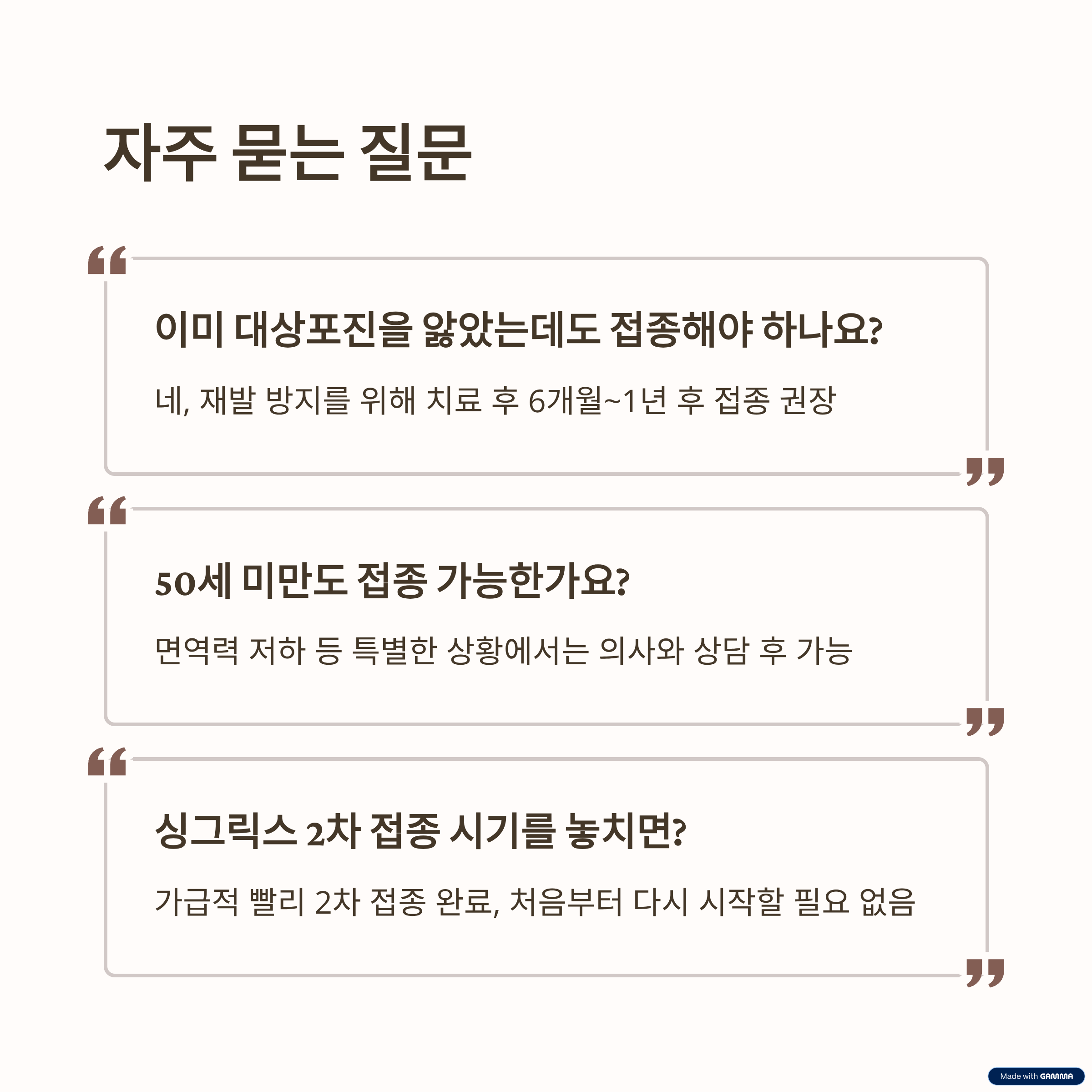 - 면역 저하자 접종 불가 - 이전에 대상포진 앓았어도 접종 가능 - 대상포진 과거력 관계없이 접종 가능 (싱그릭스) |
