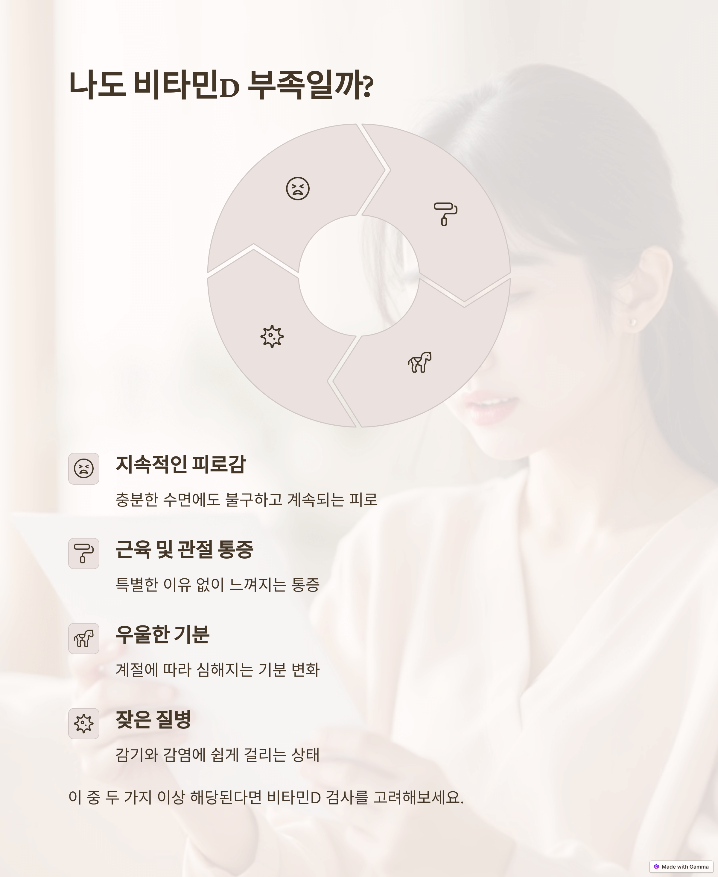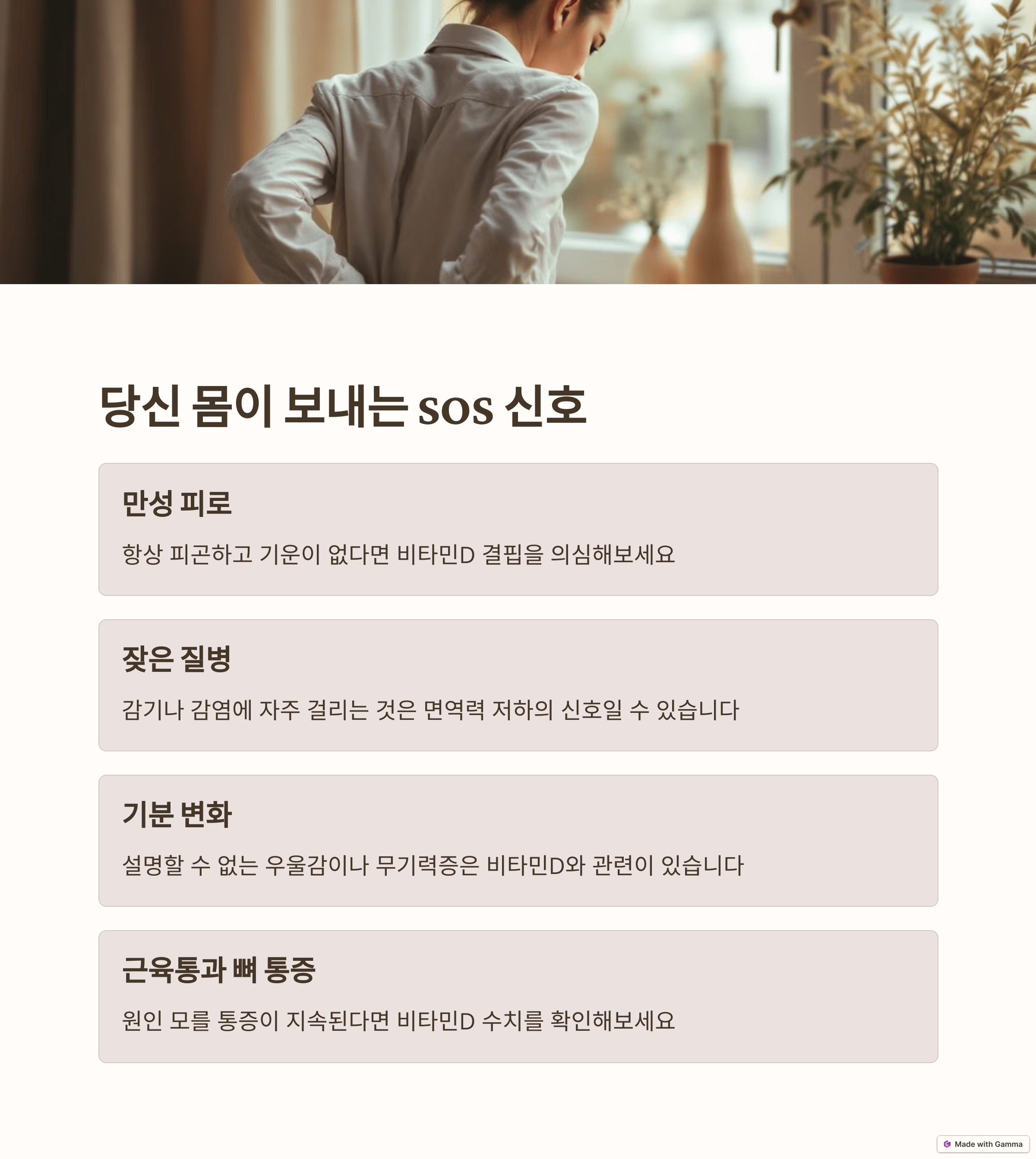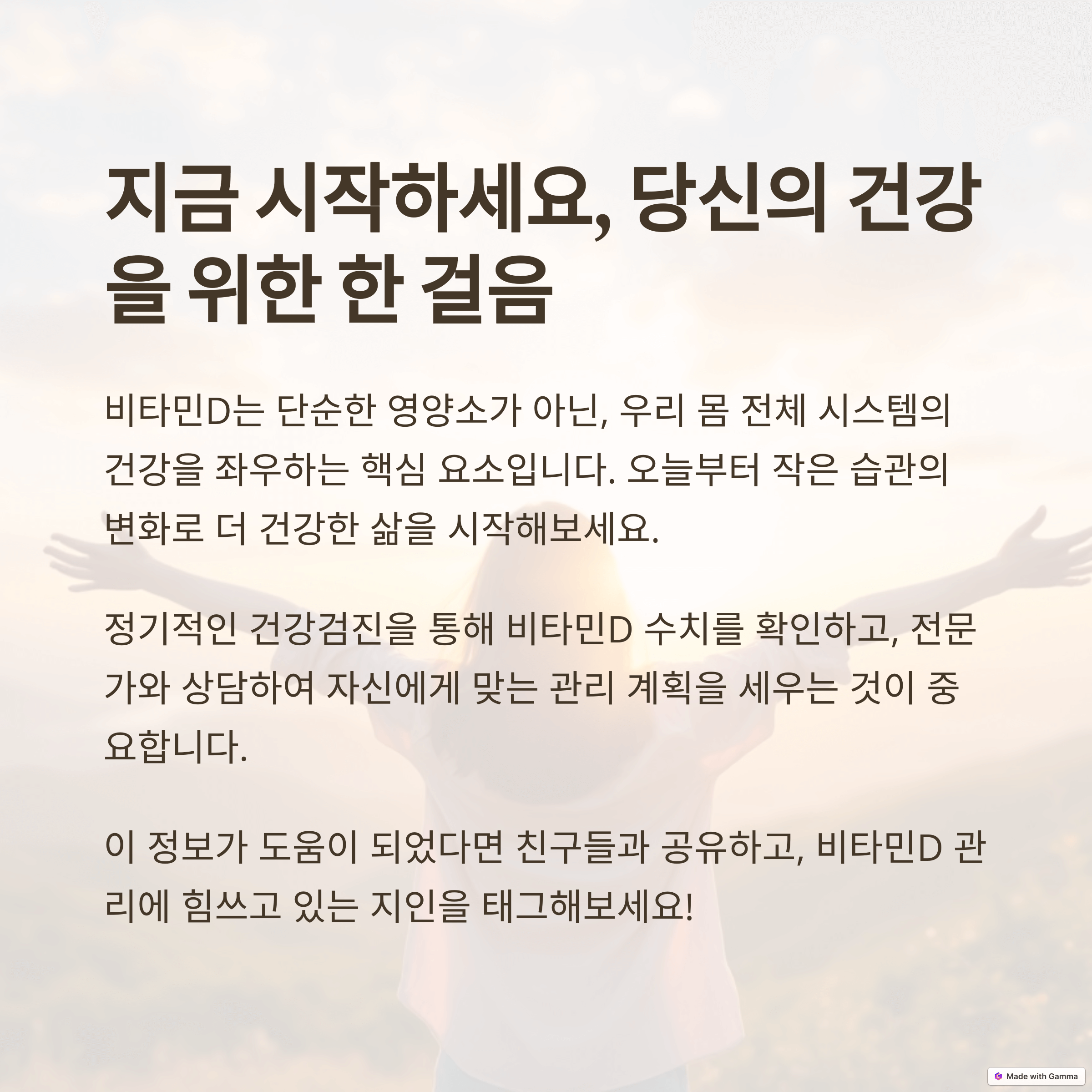 비타민D 부족은 우리 건강을 위협하는 심각한 문제입니다. 오늘 알려드린 심층 자가진단과 맞춤 솔루션을 통해 비타민D 부족에서 벗어나 활기차고 건강한 삶을 누리시길 바랍니다.