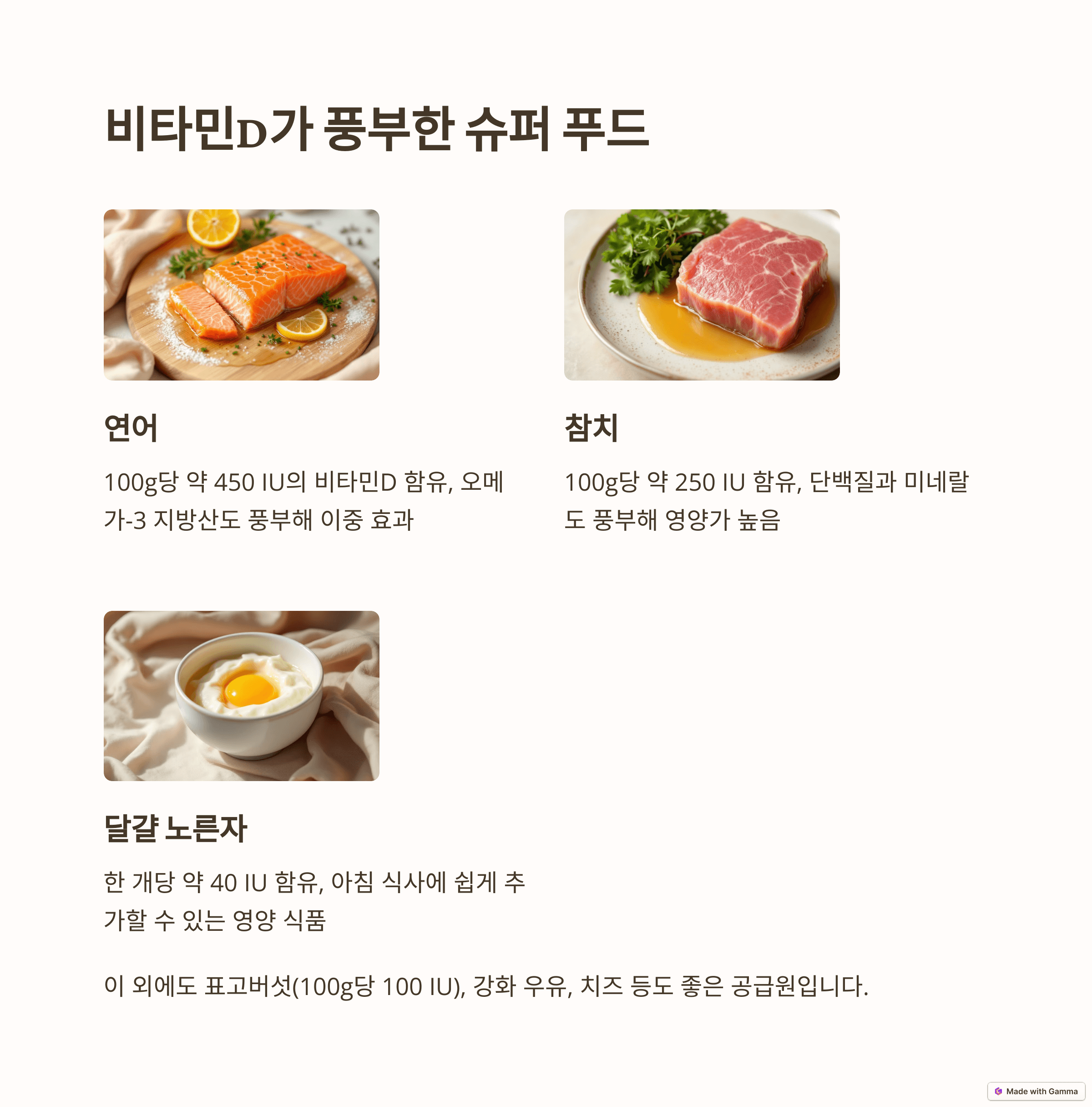 - 팁: 비타민D 강화 식품(우유, 시리얼 등)을 섭취하는 것도 좋은 방법입니다.