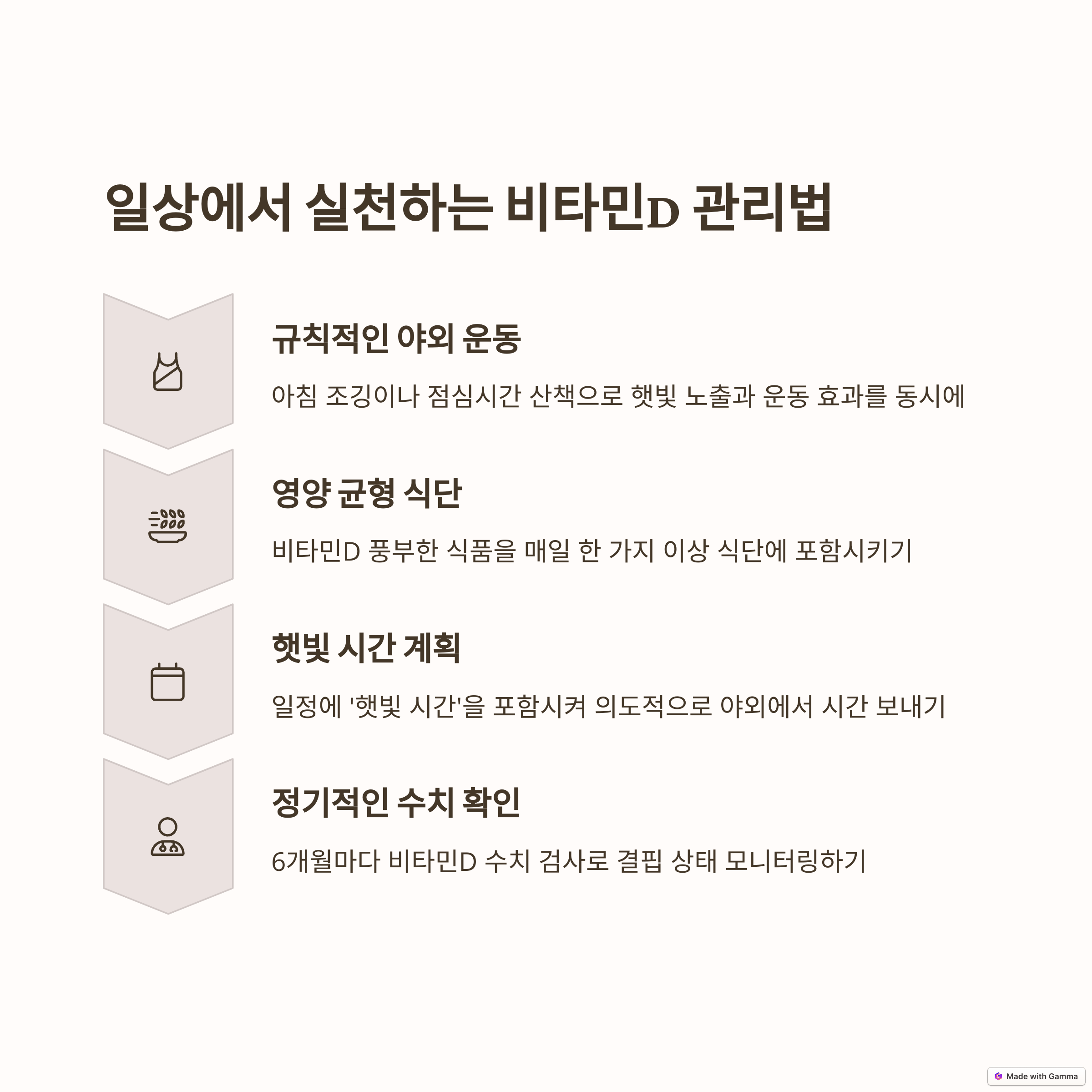 - 검사: 정기적인 건강 검진을 통해 비타민D 수치를 확인하고, 부족할 경우 전문가와 상담하여 적절한 조치를 취하는 것이 중요합니다.