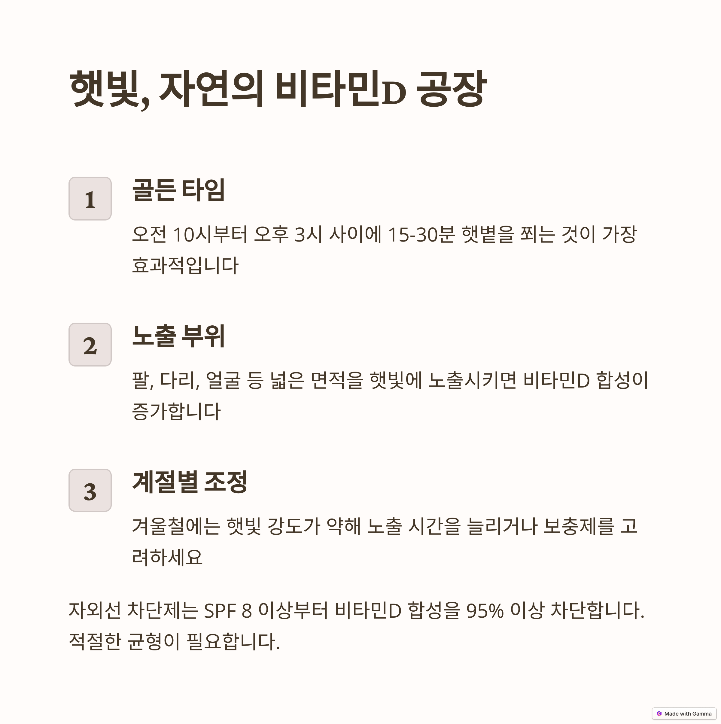 - 방법: 하루 15~30분 정도 햇볕을 쬐세요. 햇볕이 강한 시간대(오전 10시~오후 3시)를 피하고, 자외선 차단제를 바르지 않은 상태로 쬐는 것이 효과적입니다.