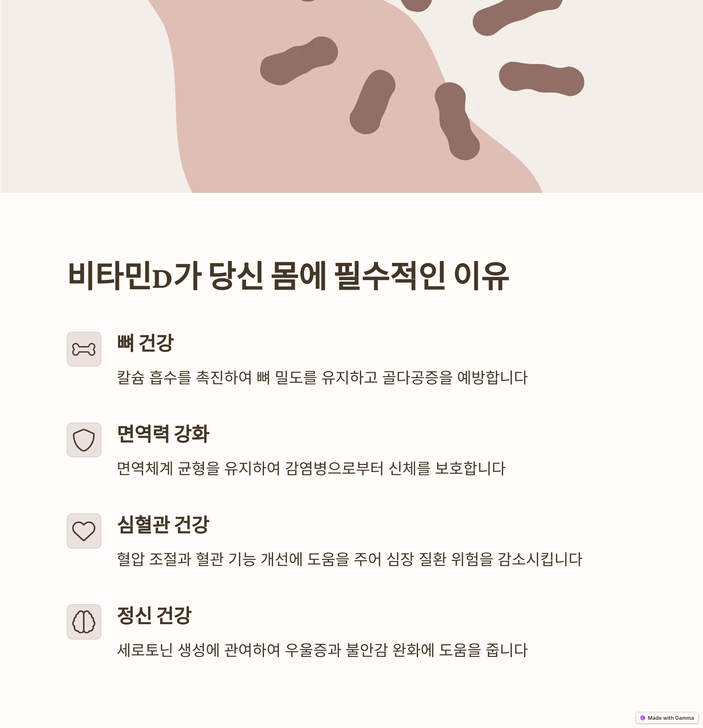 비타민D는 단순히 뼈를 튼튼하게 하는 영양소 그 이상입니다. 우리 몸의 전반적인 건강과 웰빙에 광범위하게 영향을 미치는 필수 영양소입니다.