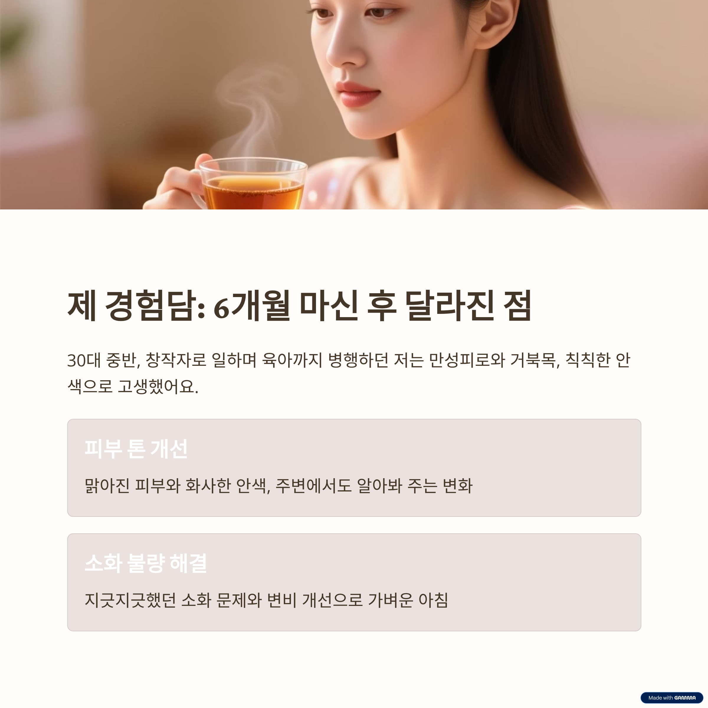 - 제가 꾸준히 마신 결과, 피부 톤이 맑아지고 소화 불량이 개선되는 체감 변화를 느꼈습니다.