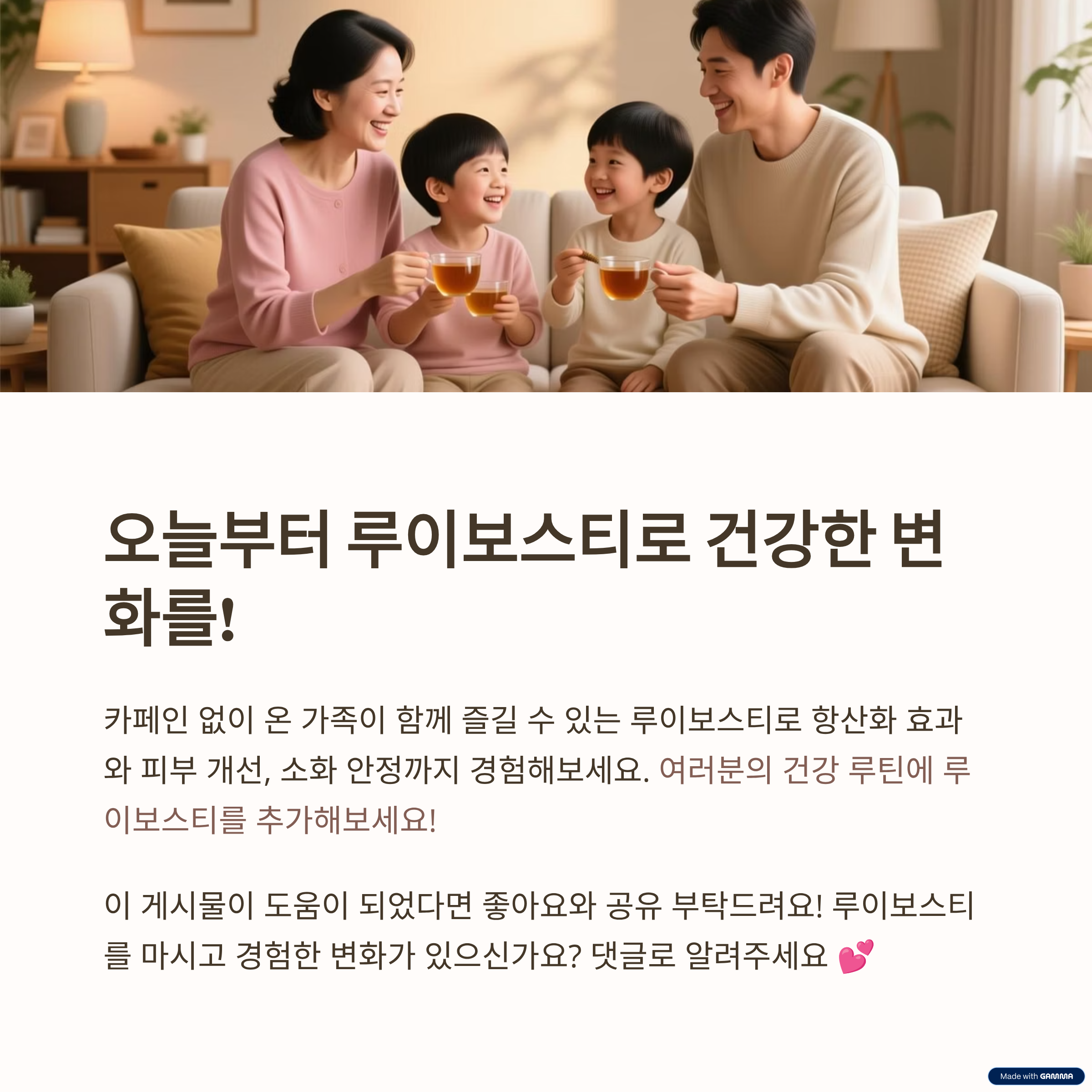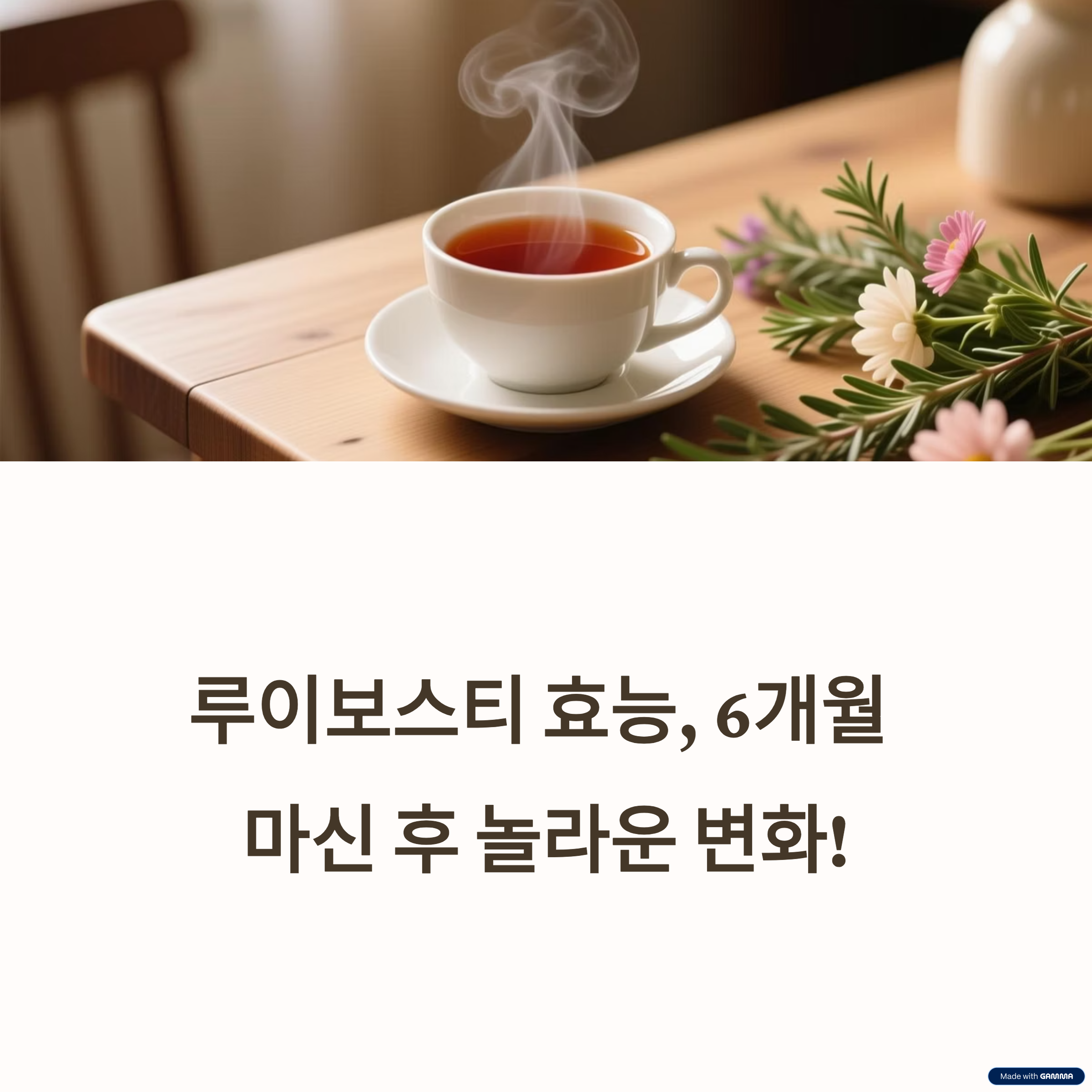 루이보스티는 카페인 걱정 없이 즐길 수 있는 최고의 건강차입니다. 강력한 항산화 성분으로 노화 방지, 피부 개선에 도움을 주고, 소화 불량, 불면증, 아토피, 혈당 관리 등 다양한 효능이 있습니다. 저처럼 6개월 이상 꾸준히 마신다면 분명 건강한 변화를 경험하실 수 있을 거예요. 다만, 저혈압이 있거나 몸이 찬 체질이라면 전문가와 상담 후 적정량을 마시는 것이 중요합니다. 오늘부터 루이보스티로 건강하고 활력 넘치는 하루를 시작해 보세요!