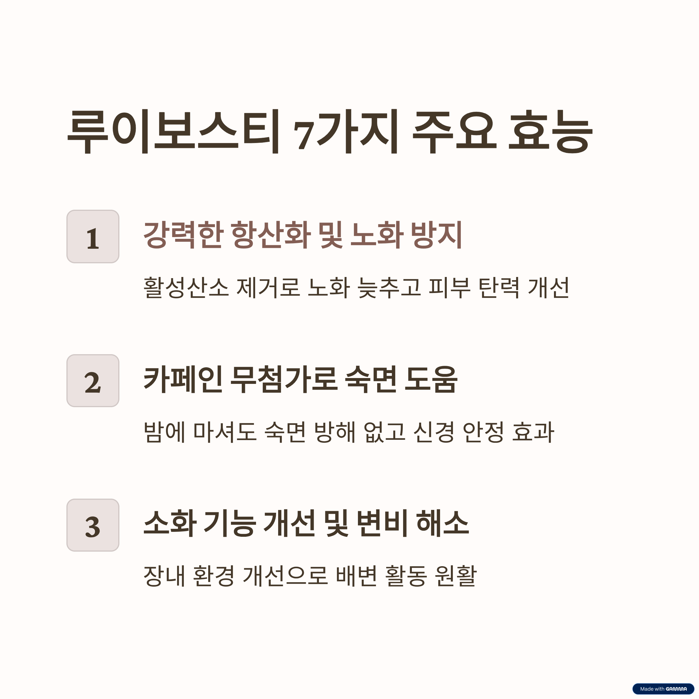 루이보스티가 가진 항산화 효과 외에도 우리 몸에 이로운 점이 정말 많아요. 제가 직접 경험하며 느꼈던 부분을 포함해 주요 효능 7가지를 자세히 알려드릴게요.