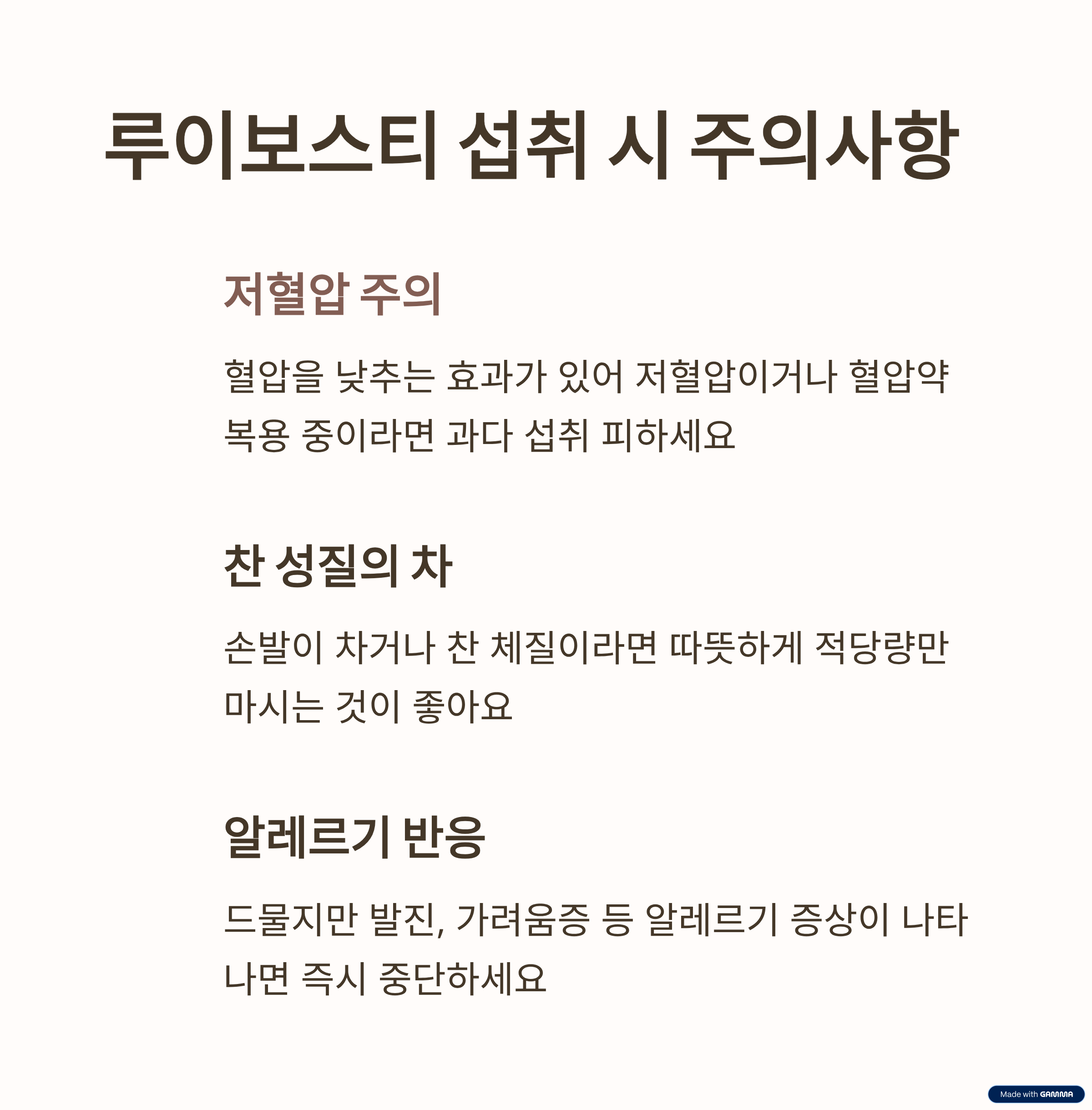 루이보스티가 아무리 좋은 차라고 해도, 모든 사람에게 100% 좋다고 할 수는 없습니다. 몇 가지 주의사항과 스니펫으로 노릴 만한 핵심 정보를 알려드릴게요.