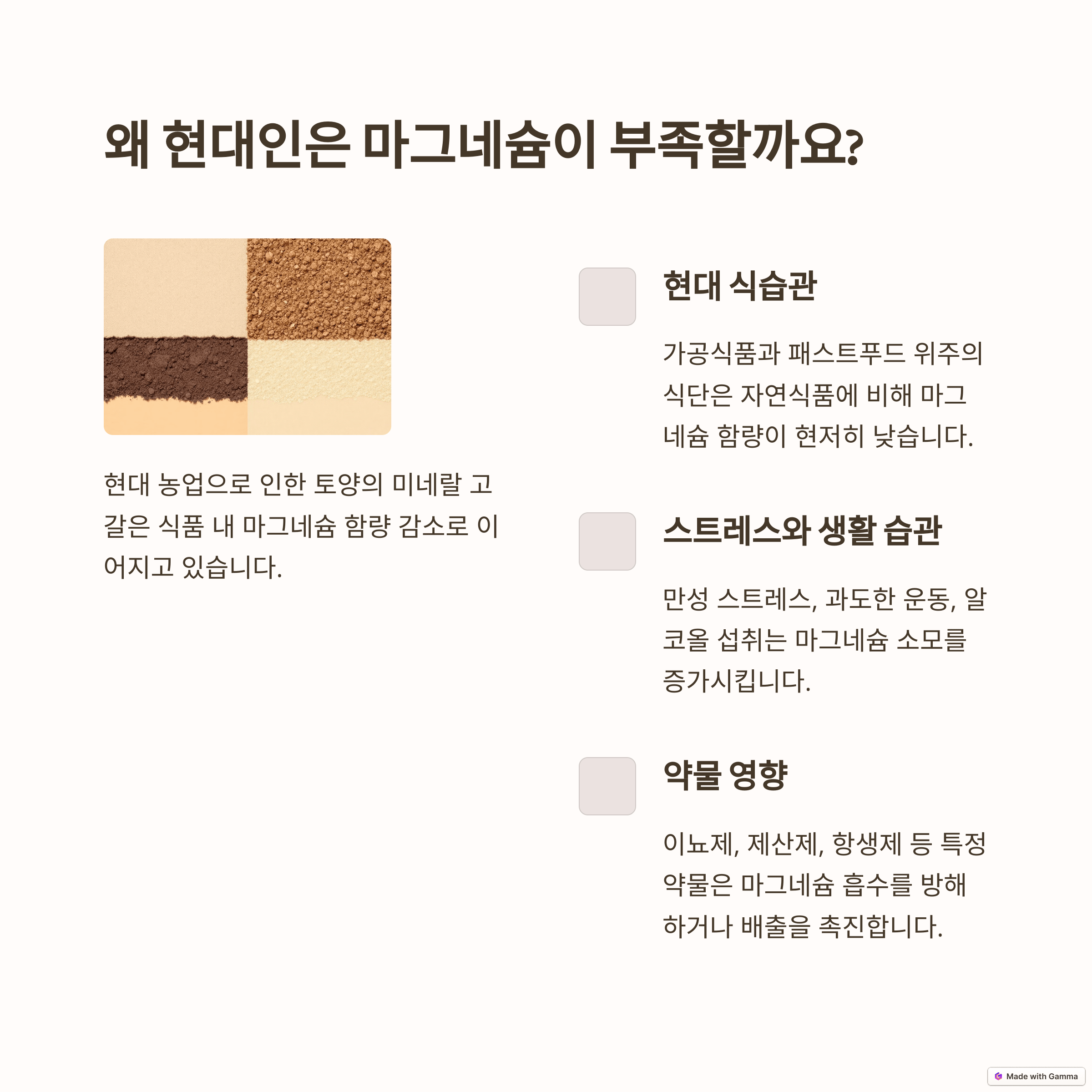 현대인의 식습관은 가공식품 섭취 증가, 불규칙한 식사, 스트레스, 과도한 카페인 섭취 등으로 인해 마그네슘 부족을 초래하기 쉽습니다. 토양의 미네랄 고갈 또한 식품 내 마그네슘 함량을 감소시키는 원인이 됩니다. 마그네슘이 부족하면 다양한 건강 문제가 발생할 수 있습니다.