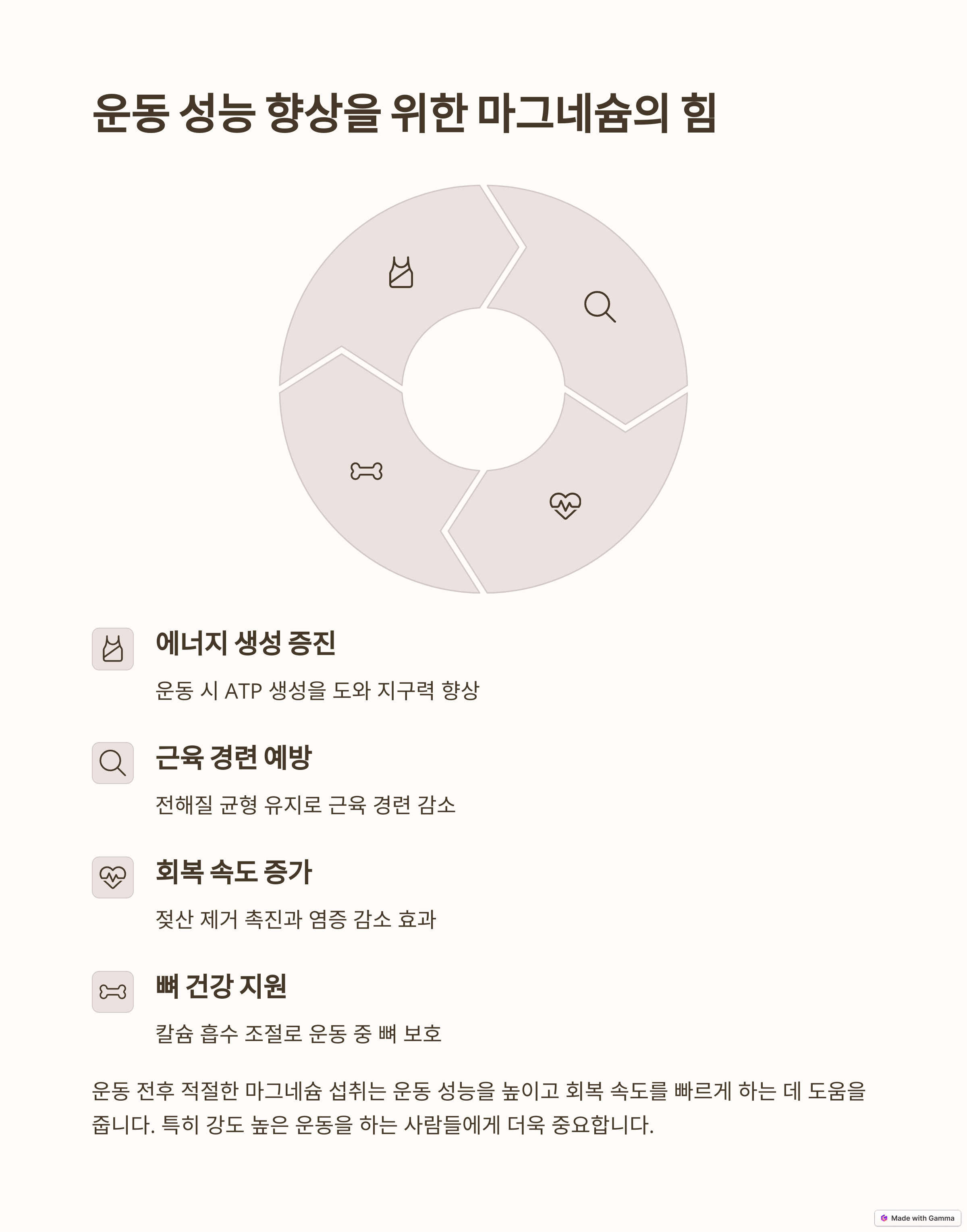 - 항산화 작용: 마그네슘은 항산화 효소의 활성화를 도와 세포 손상을 예방하고, 운동으로 인한 염증 반응을 줄여 근육 회복을 돕습니다.