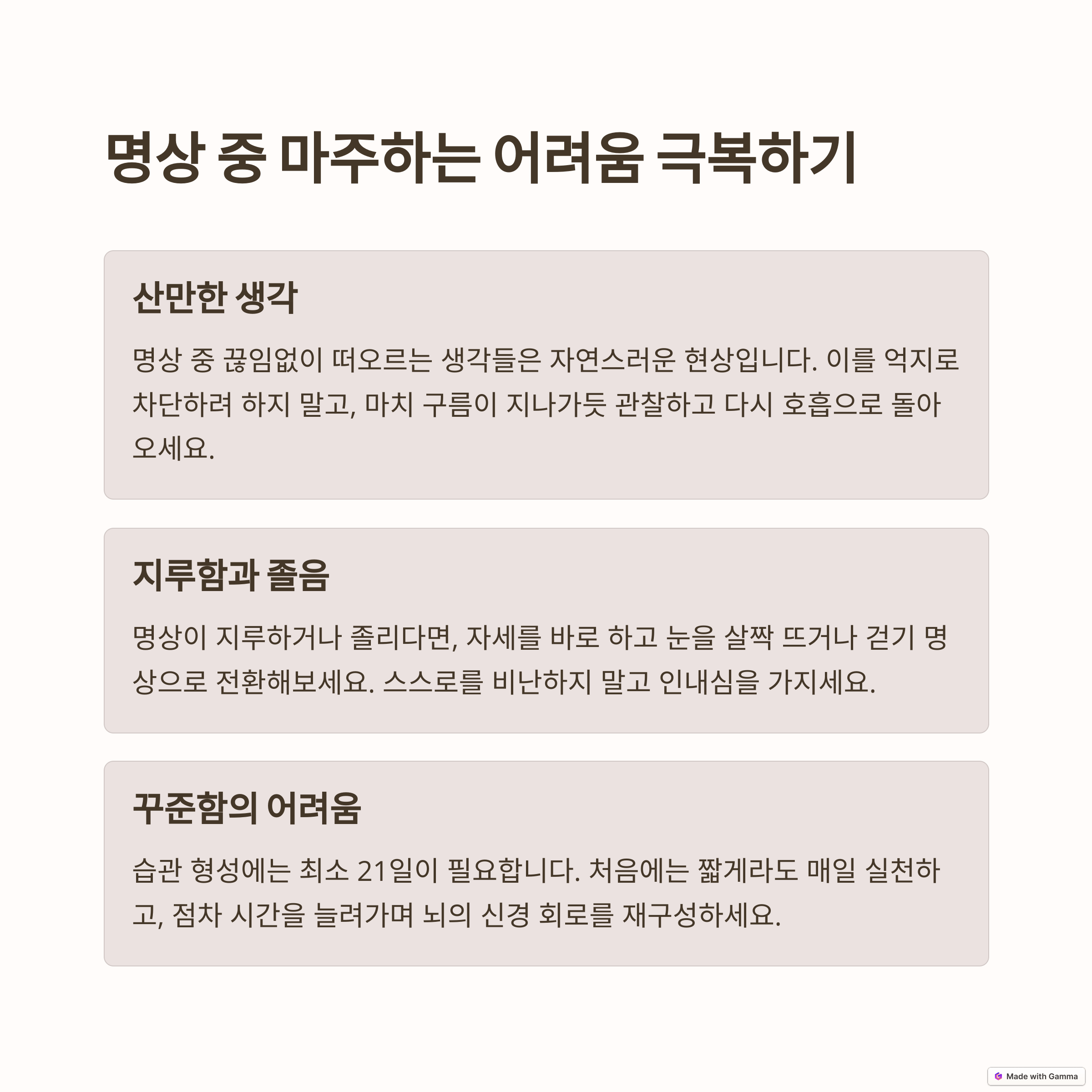- 잡념: 명상 중에 끊임없이 다양한 생각들이 떠오르는 것은 자연스러운 현상입니다. 생각을 억누르려 하지 말고, 그저 '생각이 떠올랐구나' 하고 알아차린 후 다시 호흡으로 주의를 돌립니다. 생각을 따라가지 않고, 관찰자의 입장에서 바라보는 연습을 합니다.