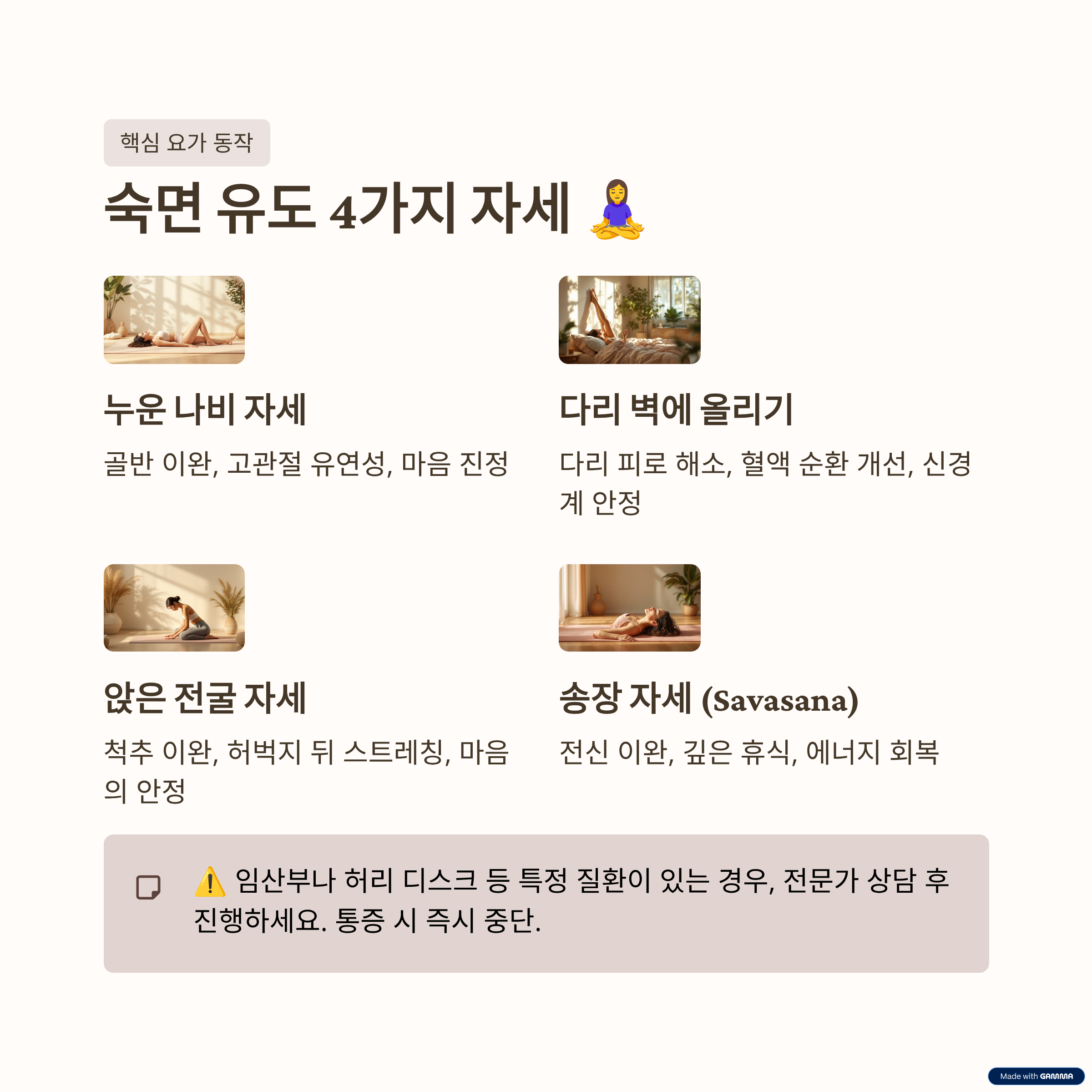 ⚠️ 주의! 임산부나 허리 디스크 등 특정 질환이 있는 경우, 반드시 전문가와 상담 후 요가 루틴을 진행해야 합니다. 통증이 느껴진다면 즉시 중단해주세요.
