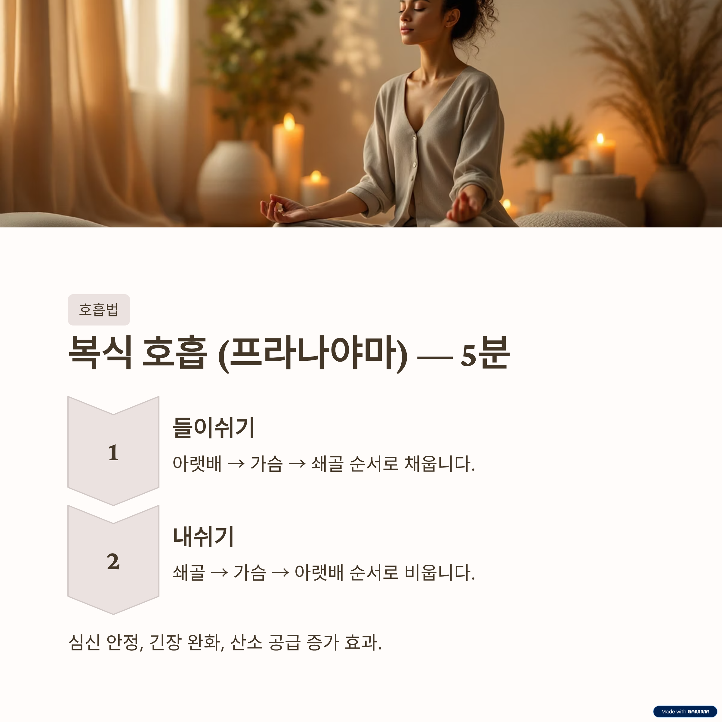 요가 동작만큼 중요한 것이 바로 호흡입니다. 편안한 앉은 자세로 눈을 감고, 다음 호흡법을 5분 정도 실천해보세요.