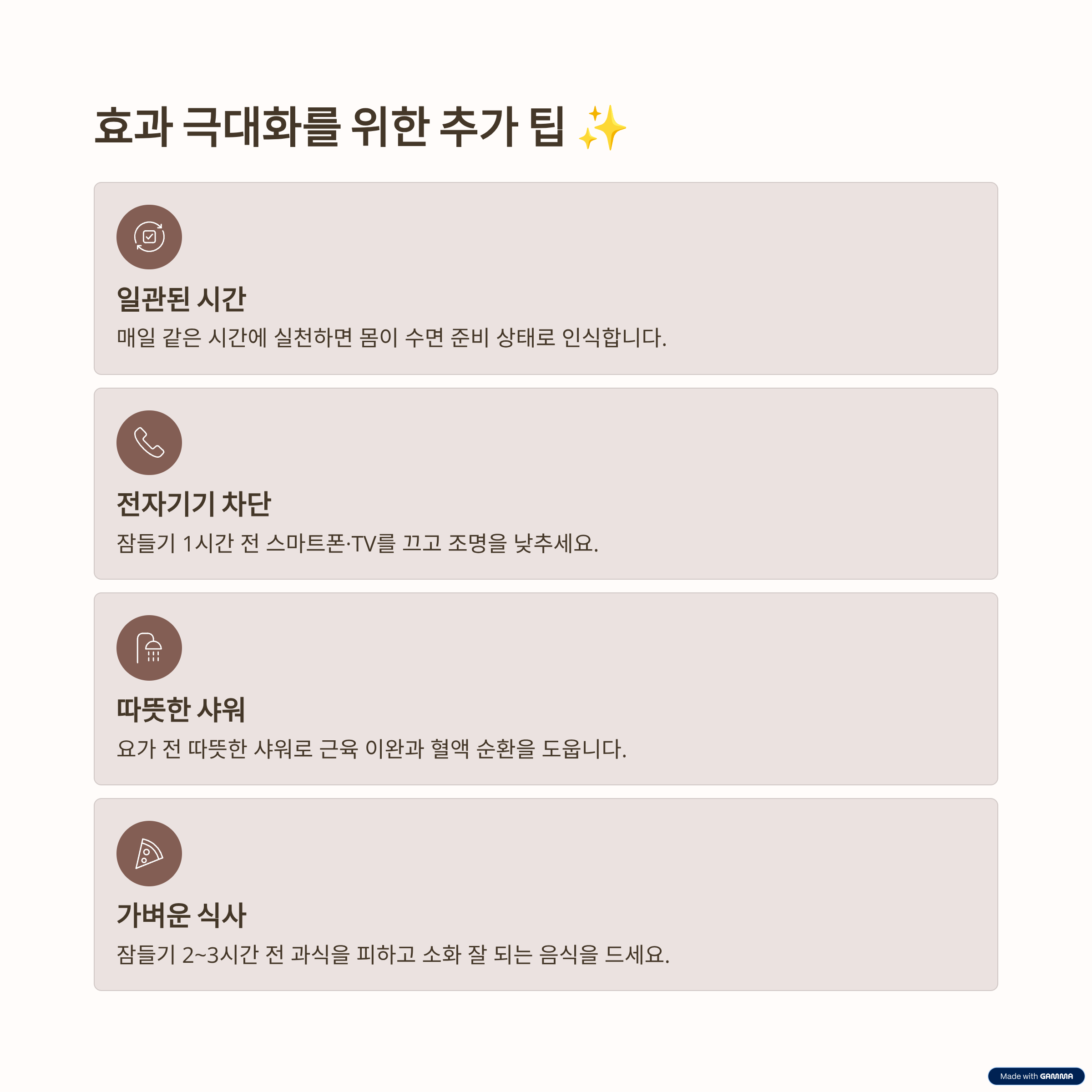 3. 꾸준한 실천과 함께 편안한 환경 조성이 숙면의 핵심입니다.