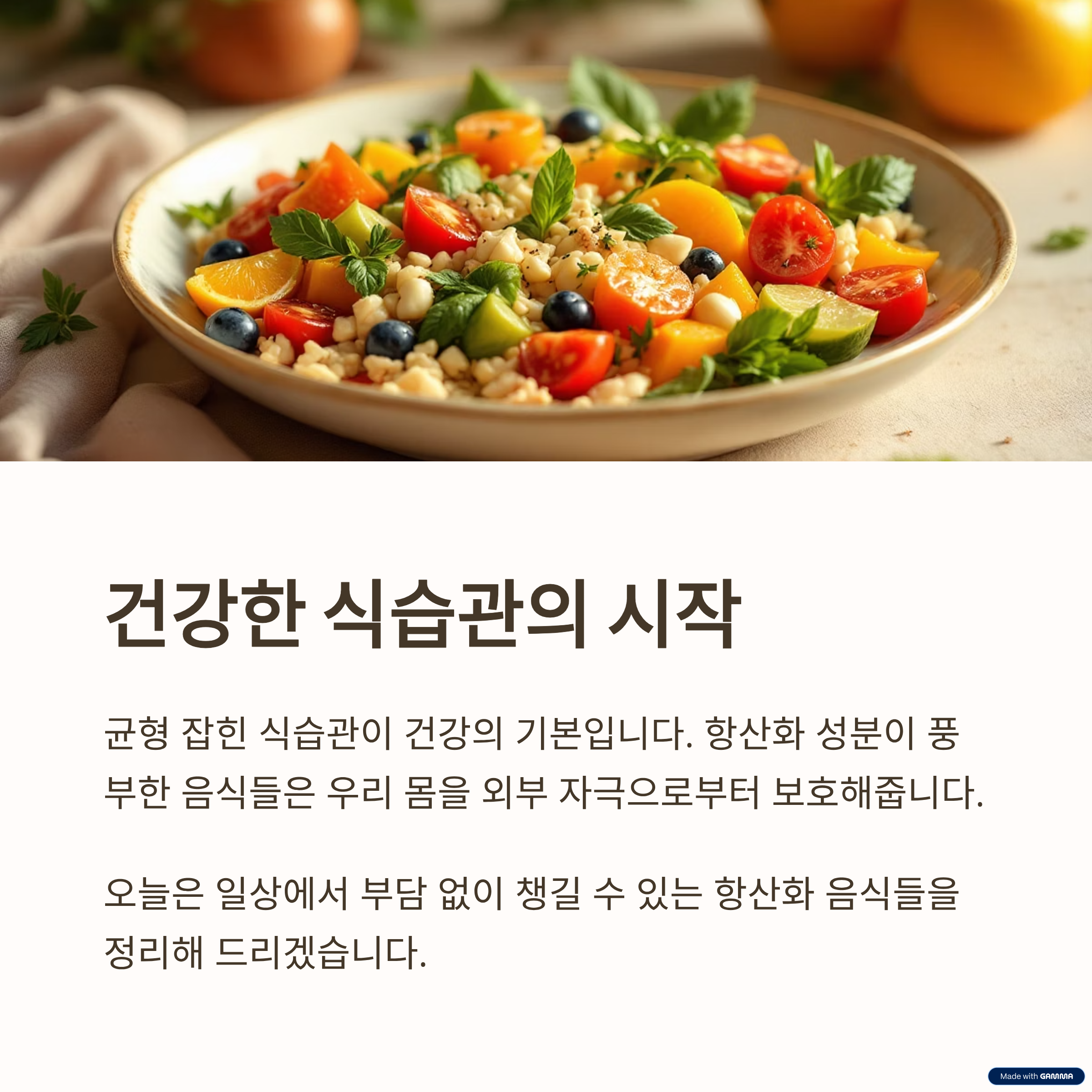 항산화 음식만 따로 챙기기보다 단백질, 탄수화물, 지방이 고르게 들어간 균형 있는 식단에 자연스럽게 포함시키는 것이 가장 좋은 방법입니다. 꾸준히 즐기면서 몸이 좋아지는 변화를 경험할 수 있습니다.