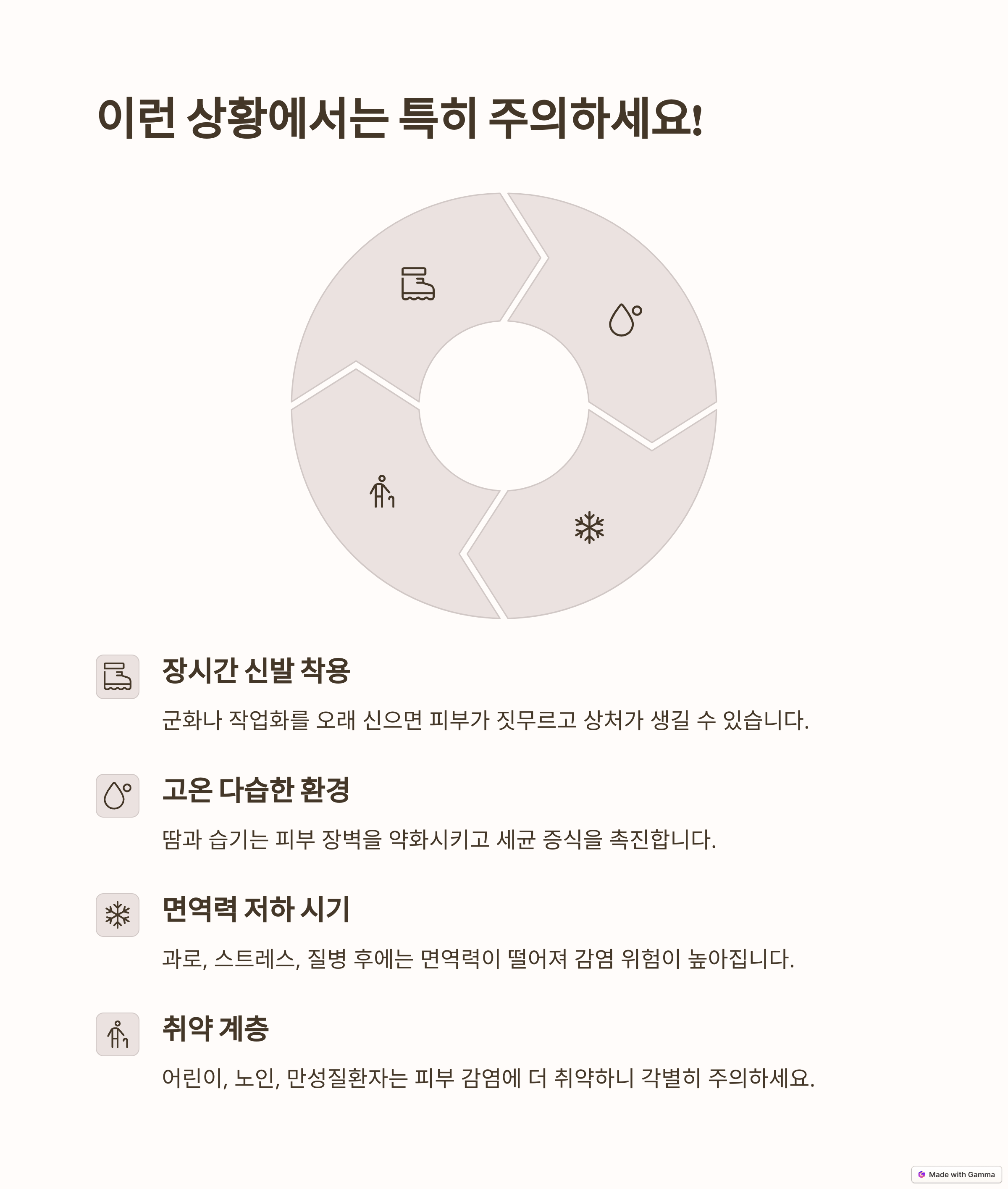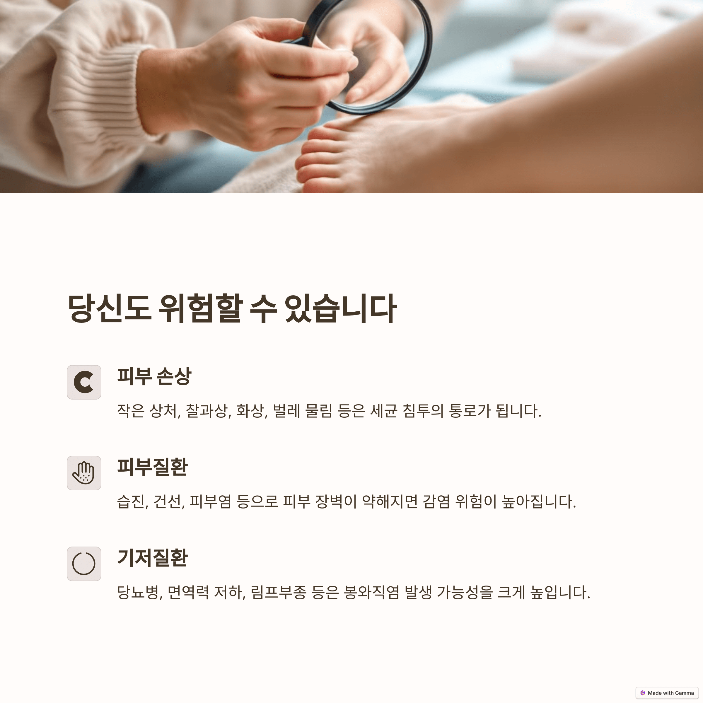 | 피부 질환 | 무좀, 습진, 아토피 피부염, 건선 등 피부 장벽을 손상시키는 만성적인 피부 질환은 봉와직염 발생 위험을 높임. |