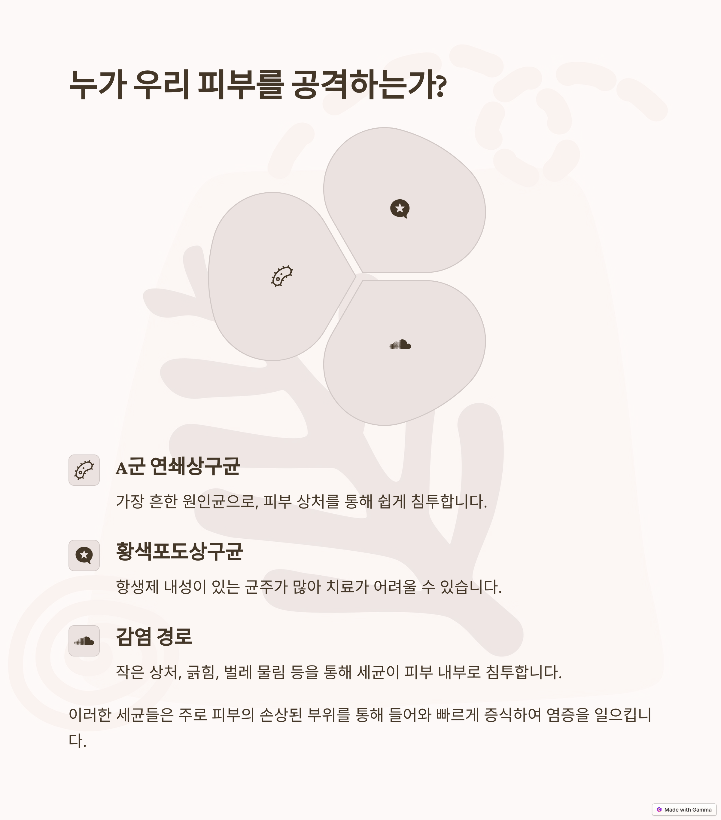 - A군 연쇄상구균 (Streptococcus pyogenes): 가장 흔한 원인균으로, 피부의 작은 상처를 통해 침투하여 염증을 유발합니다. 이 균은 피부뿐만 아니라 인후, 편도 등에도 존재하며, 다양한 감염 질환을 일으킬 수 있습니다.