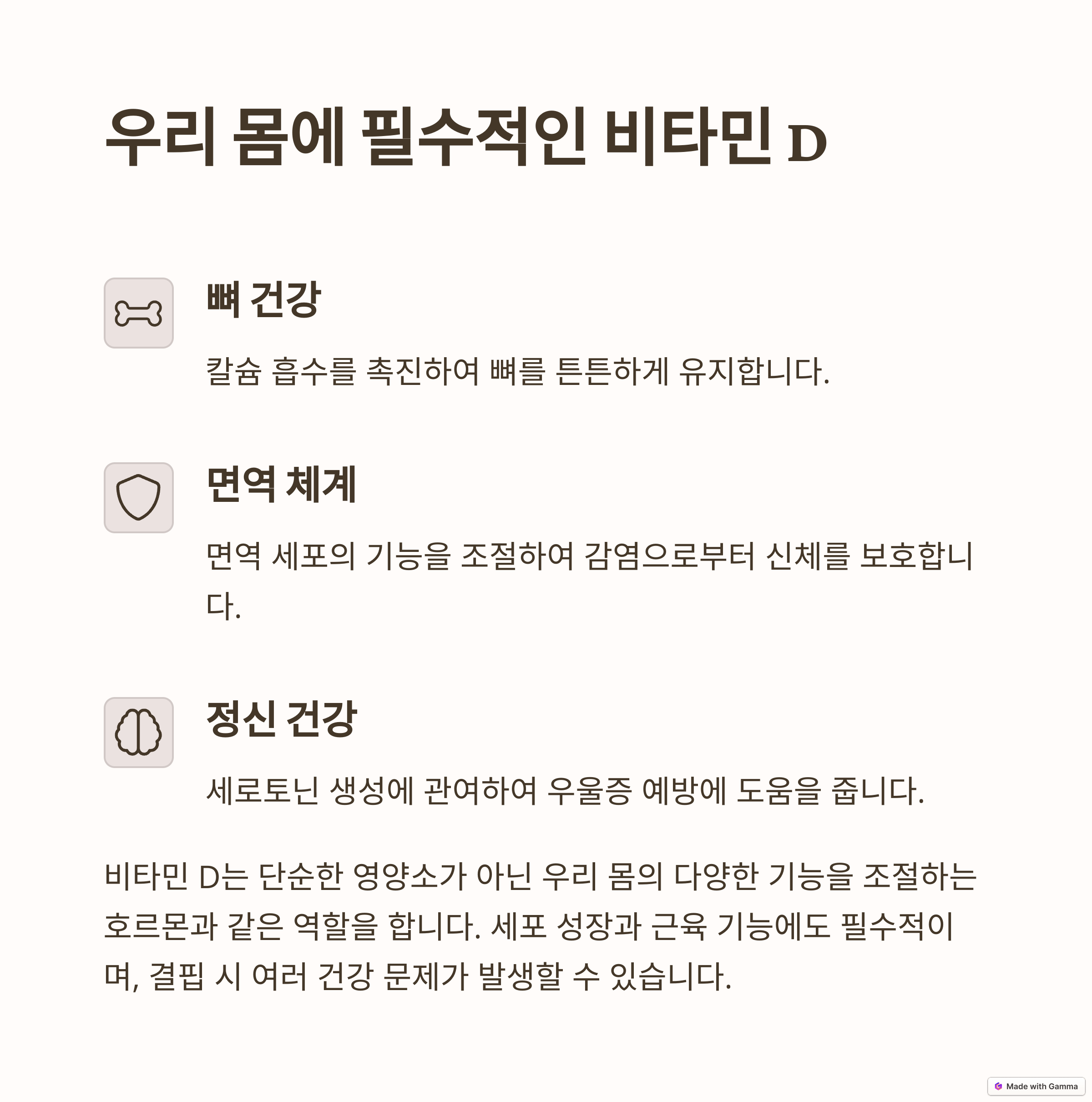 비타민 D는 단순한 뼈 건강 비타민이 아닌, 우리 몸 전체의 건강을 지탱하는 핵심 영양소입니다. 칼슘 흡수를 도와 뼈를 튼튼하게 하는 것은 물론, 면역력 강화, 근육 기능 유지, 세포 성장 조절, 심지어 정신 건강 개선에도 깊숙이 관여합니다.
