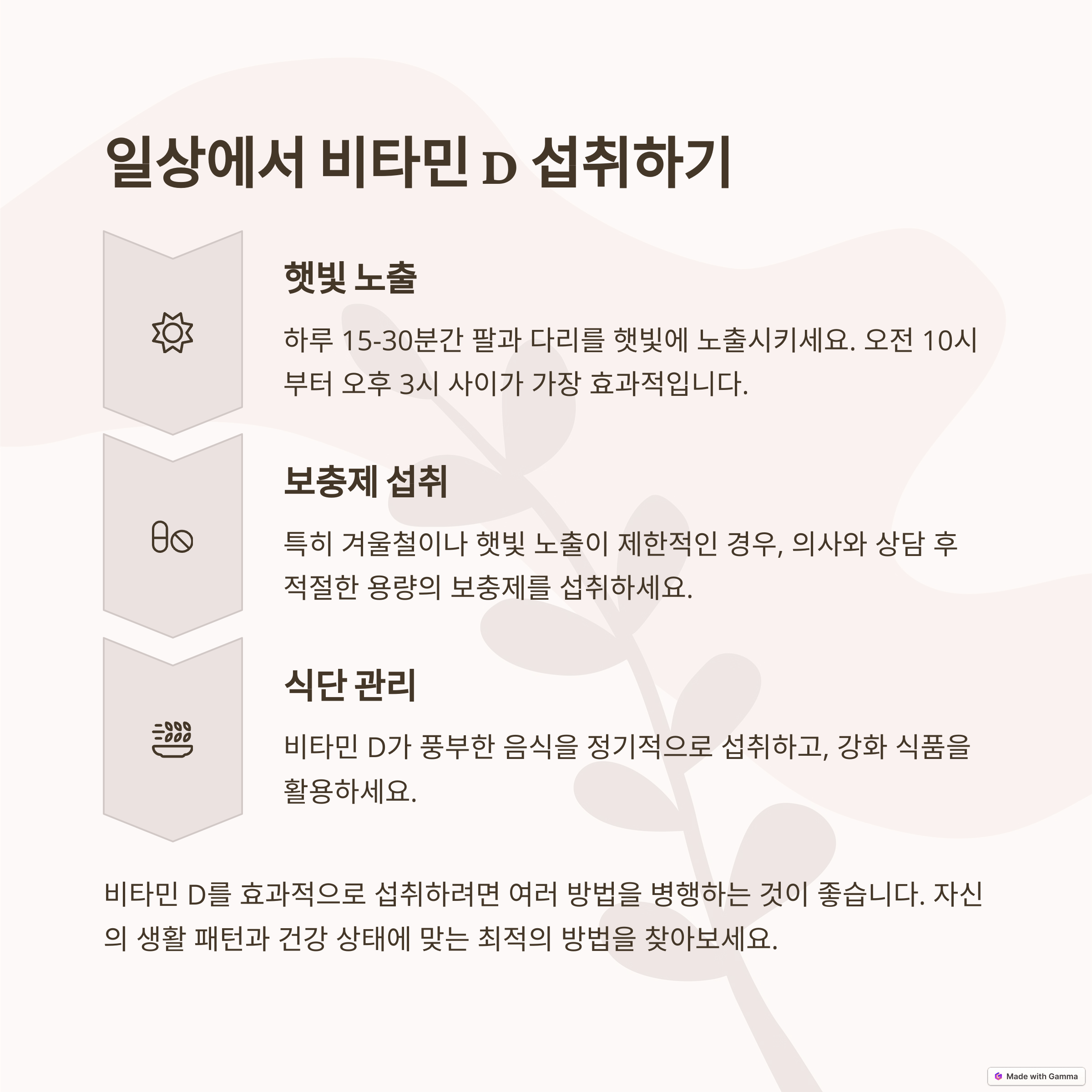 비타민 D를 효과적으로 섭취하는 방법은 햇빛 노출 늘리기, 비타민 D 풍부한 음식 섭취, 그리고 필요에 따라 건강기능식품을 섭취하는 것입니다. 햇빛은 하루 15-20분 정도 쬐는 것이 좋으며, 연어, 참치, 달걀 노른자 등의 음식을 꾸준히 섭취하는 것이 도움이 됩니다. 건강기능식품을 선택할 때는 전문가와 상담하여 자신에게 맞는 제품과 용량을 결정하세요.